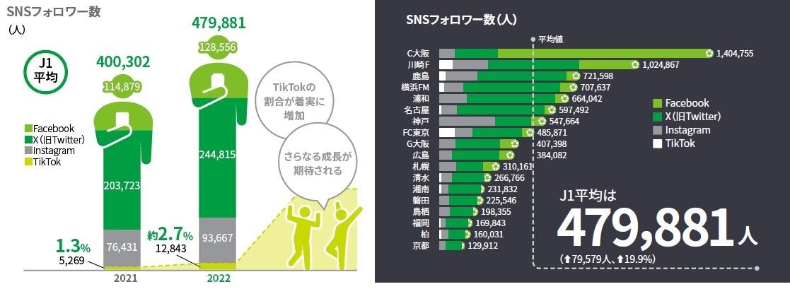 リーグ全体ではTikTokのフォロワー数増加が目立っており、川崎Fは約4.7万人、FC東京は3.2万人、横浜FMは約2.4万人を新規獲得しています。2023年1月までに横浜FM・湘南・清水・名古屋・福岡の5クラブが新たにアカウントを開設するなど、若年層への接点の拡大を狙うJ1各クラブのTikTokへの進出が加速しています。