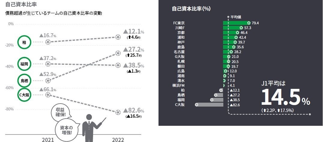債務超過となった4クラブのうち鳥栖は増資による当期利益の発生により、本KPIの値が大きく改善しました。