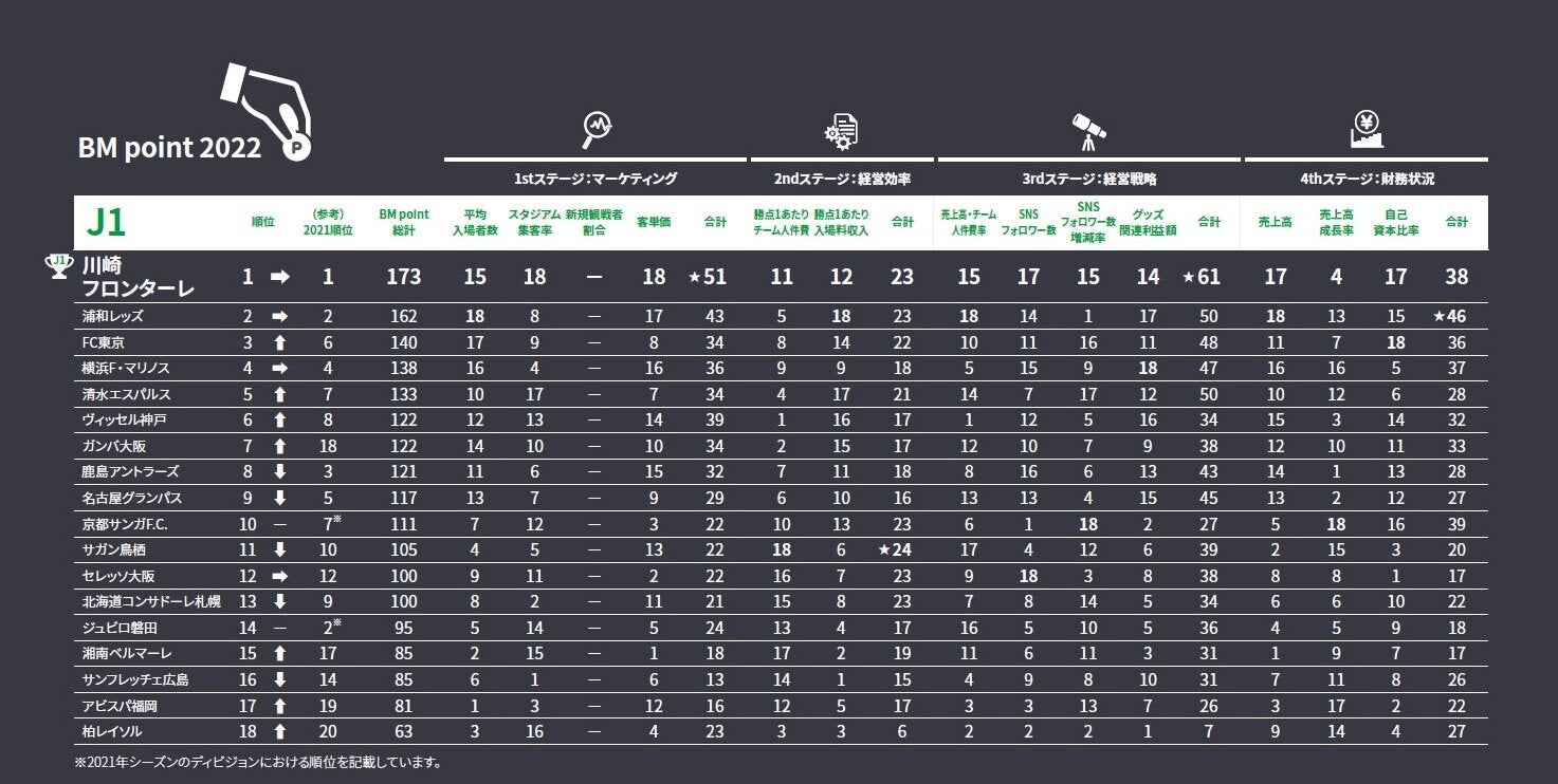 2位に11ポイント差を付けて3年連続4度目の優勝を飾った川崎Fは、マーケティング分野、経営戦略分野で1位、経営効率分野で2位タイ、財務状況分野で3位となり、特に集客率では全クラブで1位となる66.0%を記録しました。これが入場料収入を昨年の2倍以上に増加させBM面に大きく寄与しました。