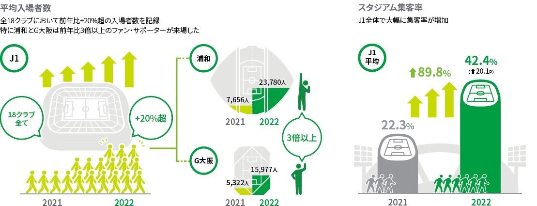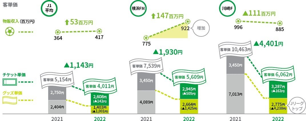 クラブ別では、入場者数の増加を背景として全18クラブ中14クラブが昨シーズンを下回り、昨シーズントップの川崎Fも大幅な入場者増に伴いグッズ単価の水準は大きく下げたもののチケット単価の減少幅はさほど大きくなく、全体ではコロナ禍前水準を大きく上回りました。
