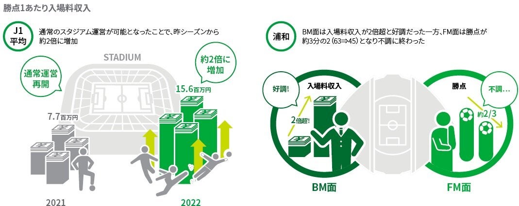 また、本KPIの順位が下位となった広島、湘南は、それぞれ入場料収入を前年比+54.6%の405百万円、+61.6%の370百万円と増加した中で、勝点も49から55、37から41へと積み上げ、ファン・サポーター側から見ても応援するクラブが勝つことにより顧客満足度が上がっており、バランスの取れた経営が行われているといえます。