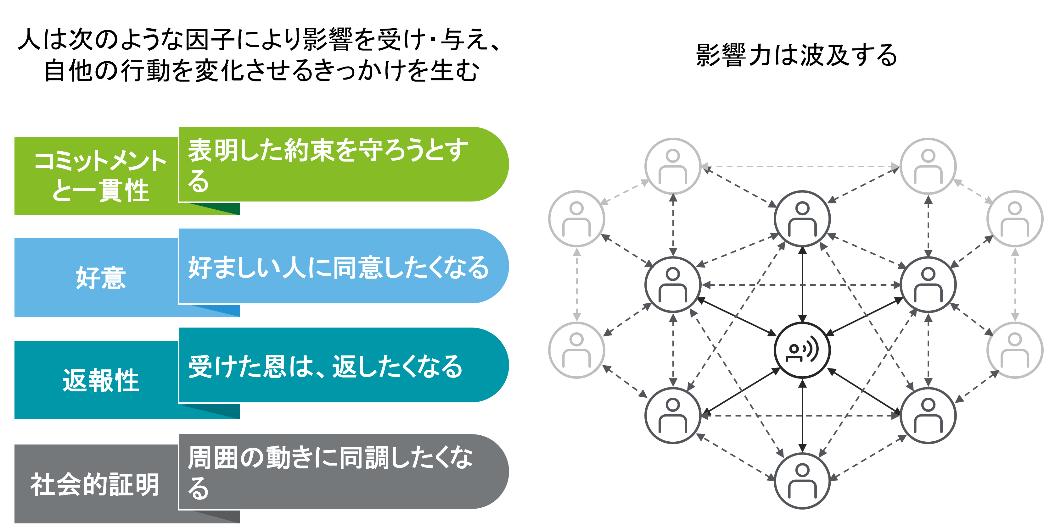 私たちは意識・無意識を問わず、普段の行動・振舞いによって周囲に常に何らかの影響を与えています。そもそも、「影響力」とは、働きかけによって人の心を動かし行動を喚起したり、考えを変容させたりする力のことで、影響力が波及するきっかけを生む「コミットメントと一貫性」「好意」「返報性」「社会的証明」という4つの代表的な因子があります。