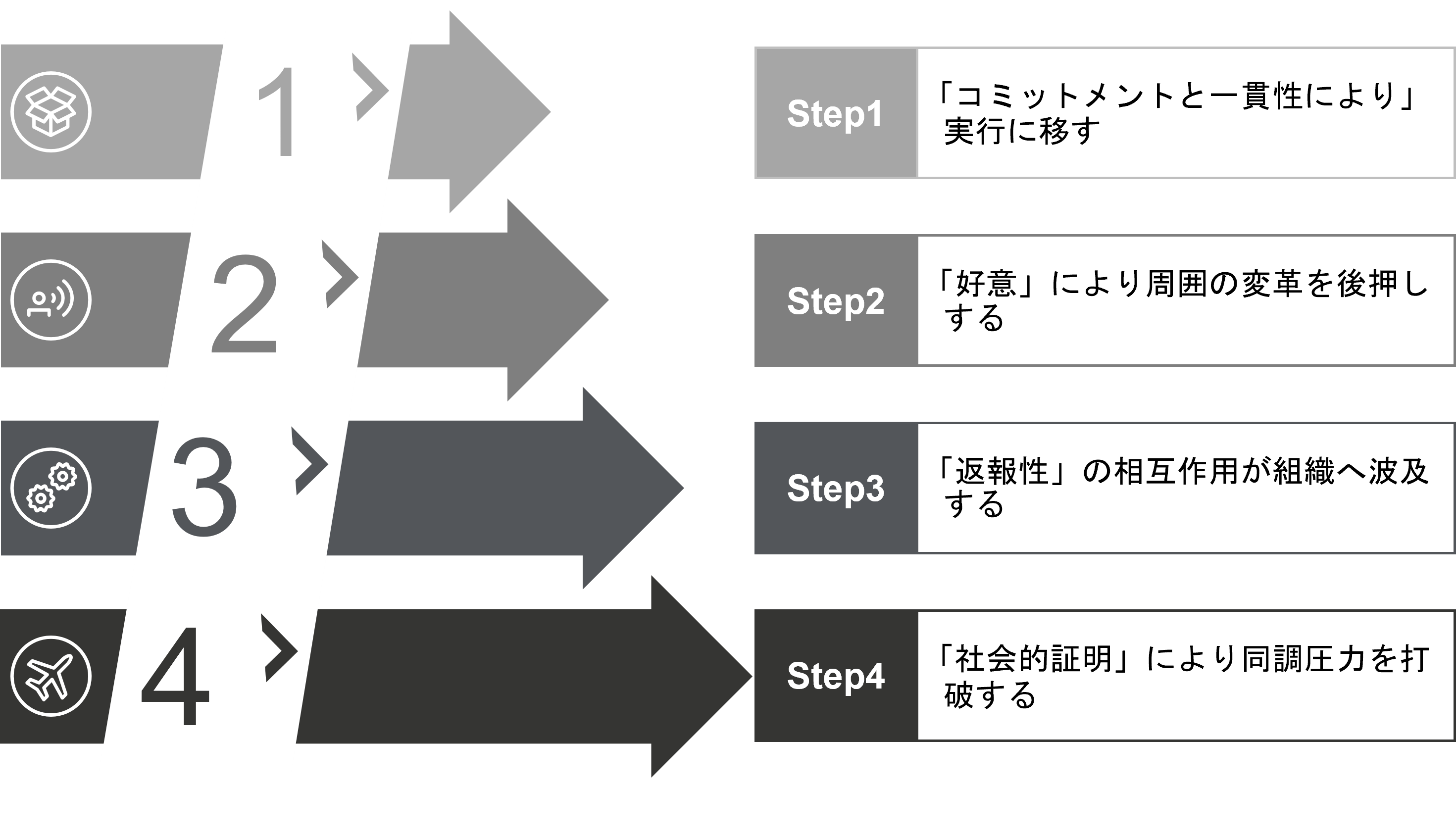 上記の解説はやや概念的になりますが、自己から組織へ徐々に影響力が及ぶことを示唆しています。注意しなければならないのは、「影響力」はマイナスにも働き得るという点です。誰も行動を実行に移さなければ、「好意」も「返報性」も作用しないばかりか、“行動しない”ということに対して「社会的証明」が働いてしまい、同調圧力に飲まれ、組織風土は元の状態に回帰してしまいます。
