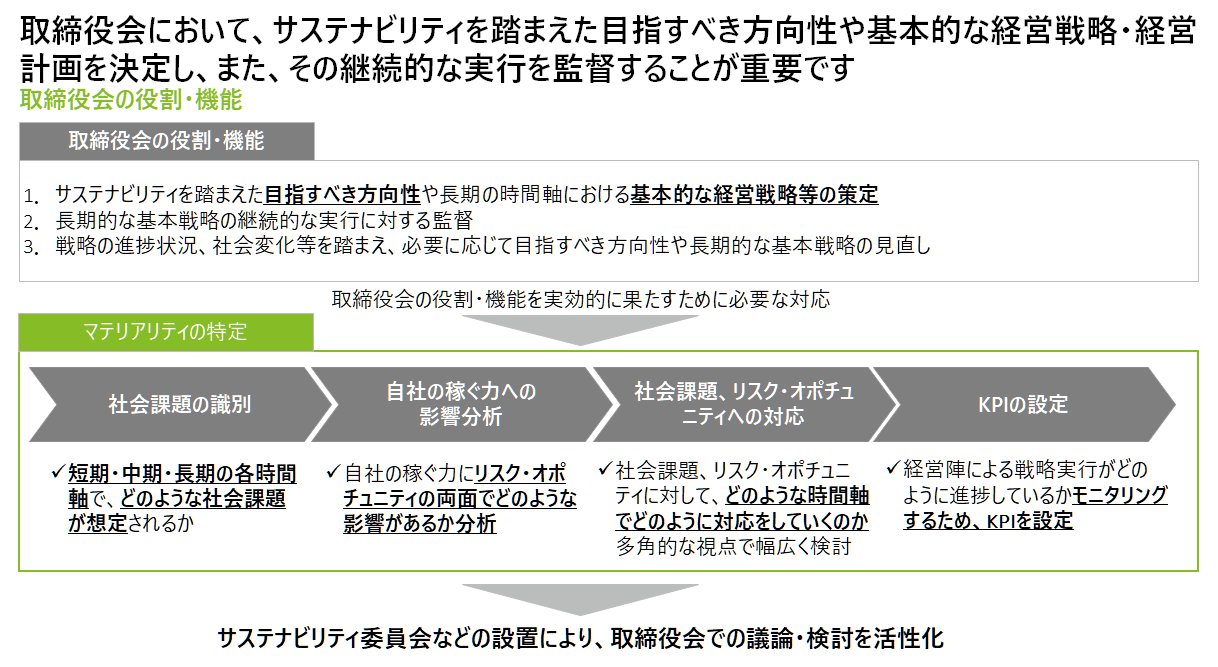 コーポレートガバナンスが取締役会に求める機能は「会社の目指すべき方向性や基本的な経営戦略の策定、および監督機能の発揮」であり、これはサステナビリティの文脈でも同様です。この役割・機能を果たすためには、①自社をとりまく社会課題の識別、②自社への影響をリスク・機会の観点で分析、③対応する時間軸の設定、④モニタリングのためのKPIの設定、の4点が必要となります。