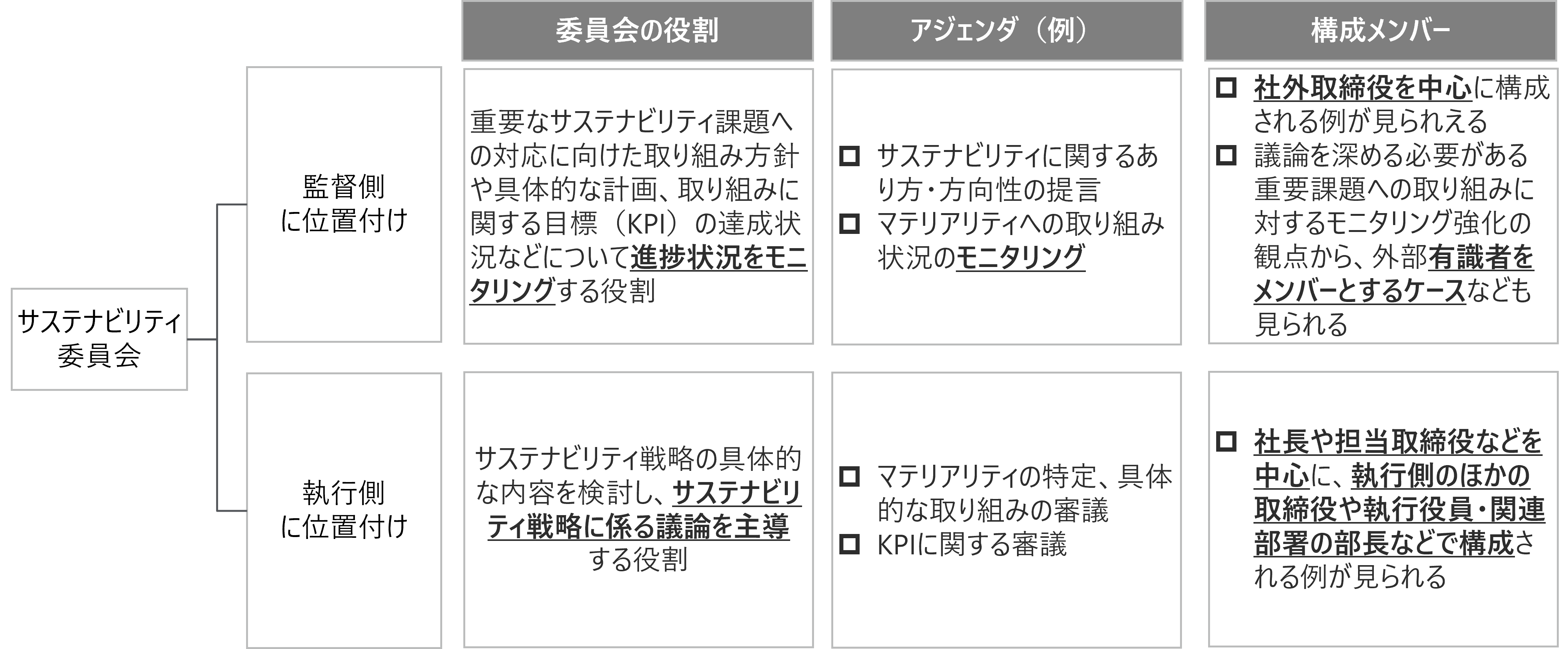 サステナビリティ委員会は、ガバナンス上の位置付けによって役割や構成メンバー、議論する内容が変わってきます。