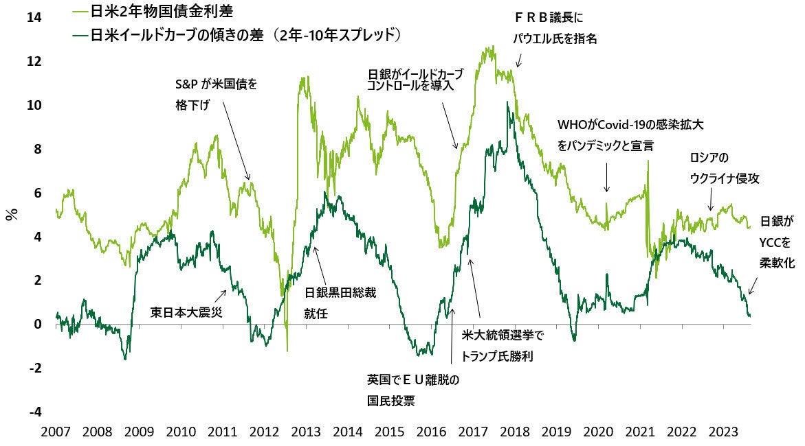 日米の長期金利差(10年物国債金利から2年物国債金利を引いたスプレッドの差)が1%ポイント拡大した際のドル円への影響は、円安ピーク時の2.5%(22年10月時点)から、0.5%(23年9月時点)まで低下しました。