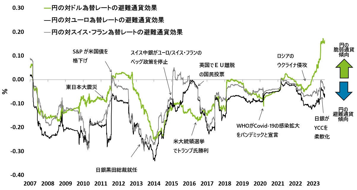 かつては世界経済の先行きの不確実性が高まる際、避難通貨(安全資産)需要による円高が進行していたものの、22年は危機時の円買いが明確に観察されませんでした。23年に入り、円は避難通貨のトップとしての役割を完全に米ドルに譲り渡しています。