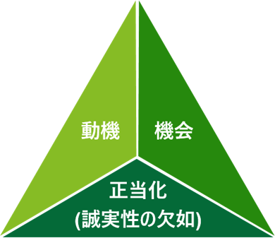 不正は、不正行為を実行する事情となる「動機」、不正行為の実行が可能な環境にある「機会」、不正行為の実行を是認する主観的な事情を指す「正当化」という3つの要素が揃ったときに発生するといわれています。「動機」「正当化」に対するアプローチが無ければ、不正を企図する者が「機会」をくぐり抜け、不正の実行に及ぶ潜在的な恐れは常にあるといえます。そして、「動機」「正当化」には人間の心理的要素が多分に影響を及ぼすため、コントロールすることは困難です。