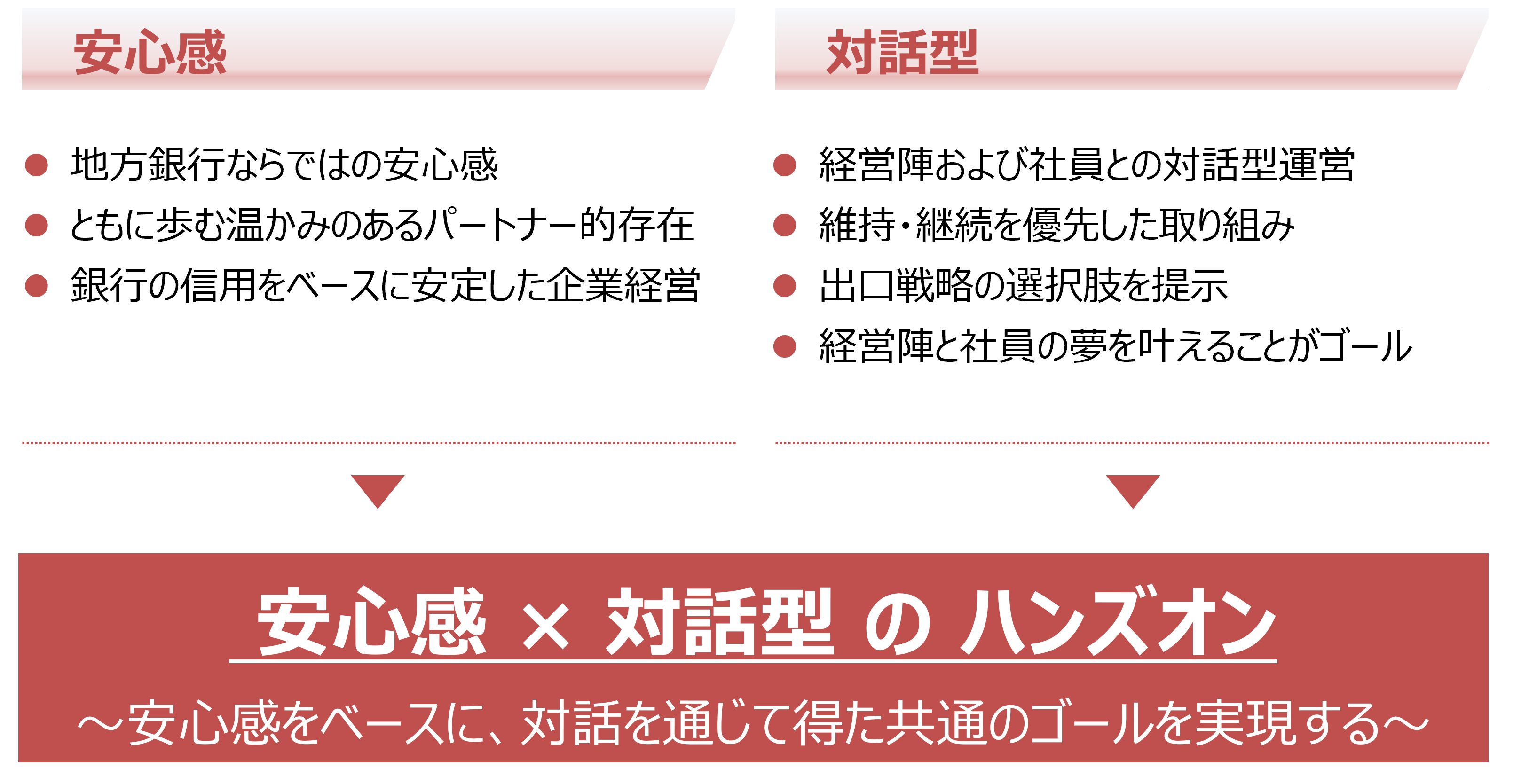 身近な存在の銀行という立場を生かして、事業承継についてのお悩みをお客さまから引き出し、寄り添いながら、目指す姿に向かっていけることが当ファンドの強みだと考えています。投資をおこなった後は、会社のコンセプトにマッチする後継人材を一緒に検討し、彼らを中心に、会社自身で事業計画を描いていくことが多いです。