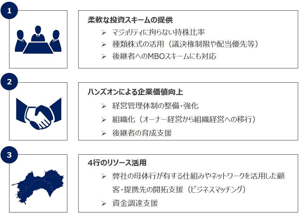 当ファンドは特に4行の地盤である四国地域において、事業承継の問題でヒトも企業も減っていく状況を何とかしたいという強い思いが基になって創設されました。