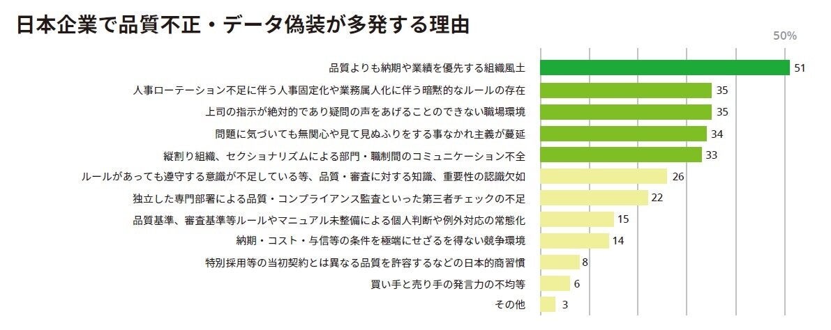 ――品質不正・データ偽装の理由を尋ねる設問の回答結果が興味深いです。「品質よりも納期や業績を優先する組織風土」を挙げた企業が51%にのぼり理由の第1位となっていますね。