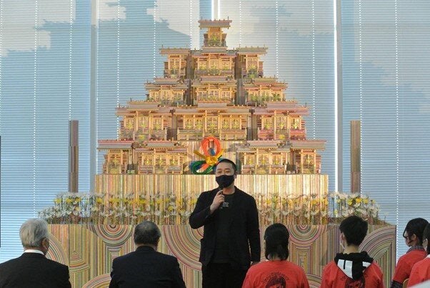 水引の生産地で実際に製造されている方から材料を仕入れる経験は、とても新鮮でした。そもそも、伝統工芸の水引は「結ぶもの」という認識で、技術を大切に受け継いでいます。一方で、私がこれまで手がけてきた水引アート作品は、独自のアイデアで制作しており、「結ぶ」以外のアート技法も多く取り入れています。そのため、地元の方たち、特に水引の伝統工芸士の皆さんにどのように受け入れられるか、期待と不安の混じる気持ちで作品発表の日を迎えました。