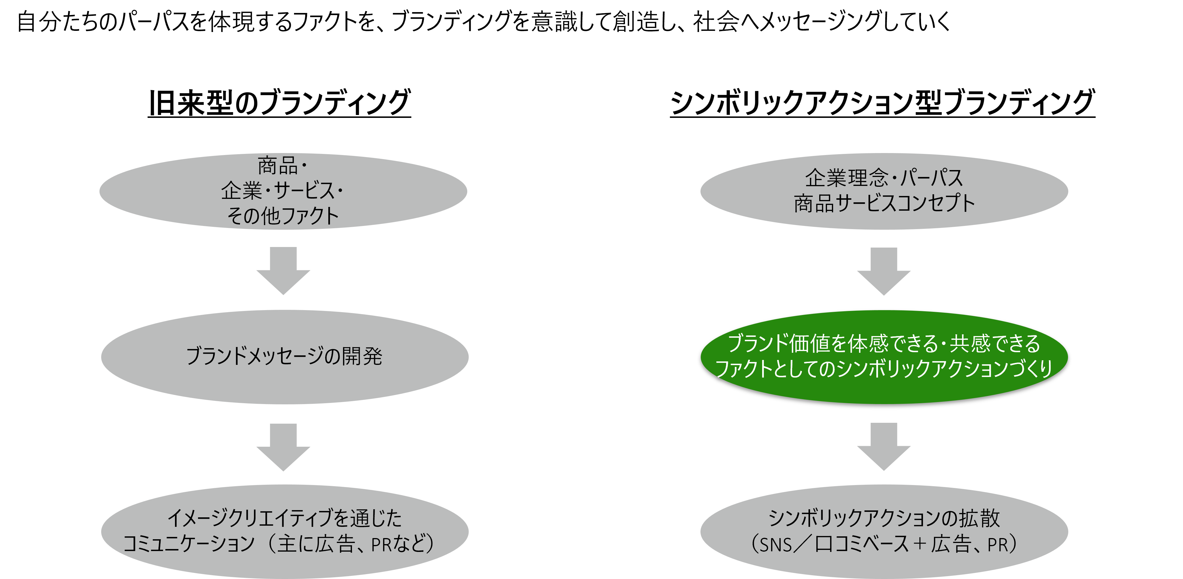 シンボリックアクションとは、企業理念・パーパス(存在意義)を起点とした自社のサステナビリティに関するイメージを示すシンボルとなる活動のことを指します。従来型のブランディングのように自社の活動から事実を集めてきてメッセージを発信するアプローチとは異なり、先にパーパス起点で世の中に伝えたい自社イメージを想定したうえで、企業が伝えたいメッセージやイメージを体験・共感できるようなファクトを作り、そこでの体験談・エピソードを拡散することでイメージを醸成していくアプローチとなります。