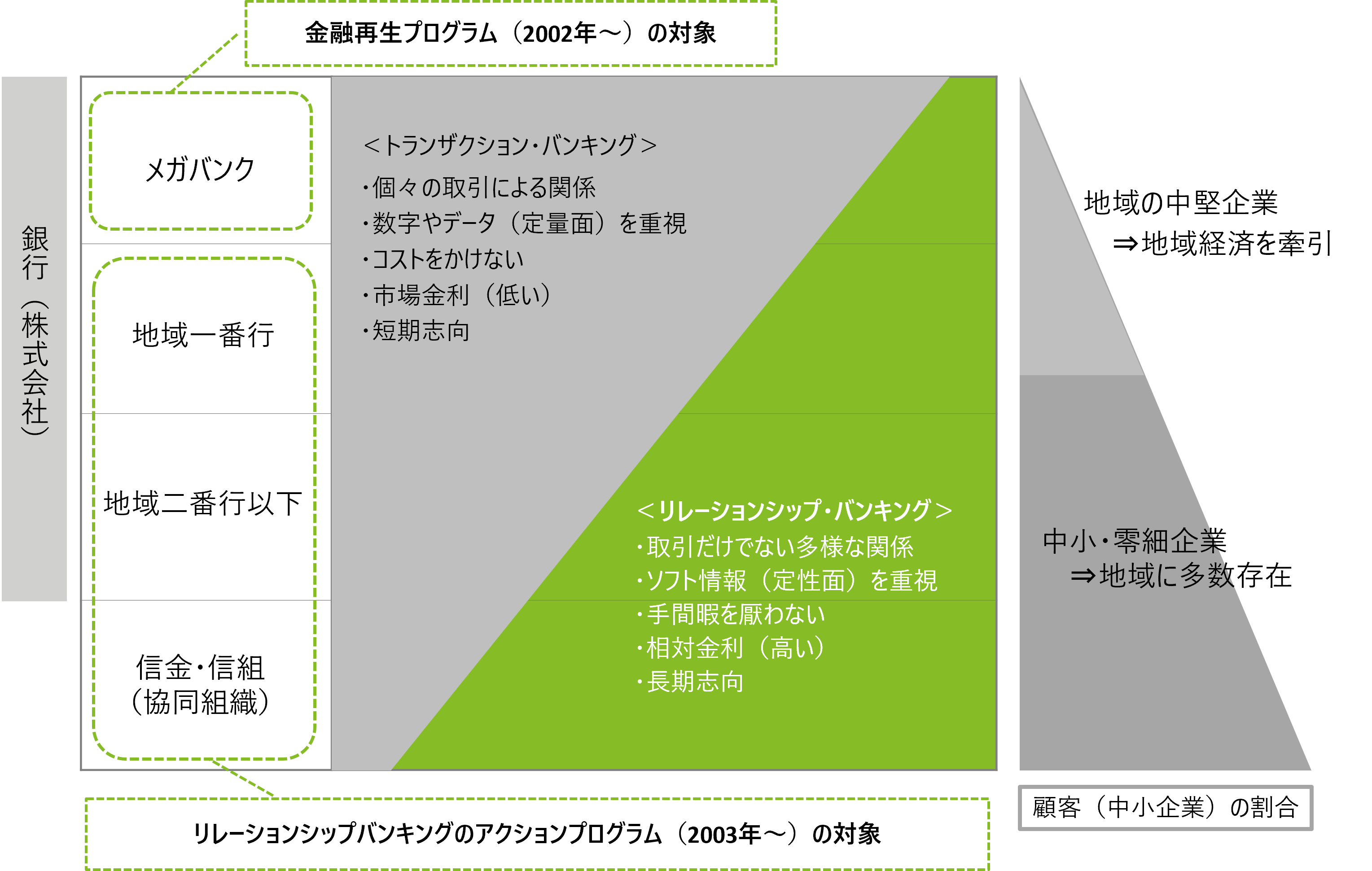 リレーションシップ・バンキング(以下、リレバン)とは、金融機関が顧客である借り手企業との間で親密な関係を長く維持することによって経営者や事業に関する情報を集め、その情報を基に融資などのサービスを行うビジネスモデルであると、金融庁は定義しました。2003年、地方銀行、信用金庫および信用組合(信金・信組)に対し、不良債権問題の解決と地域再生・活性化を両立させるために、アクションプログラムの策定を義務付けました。