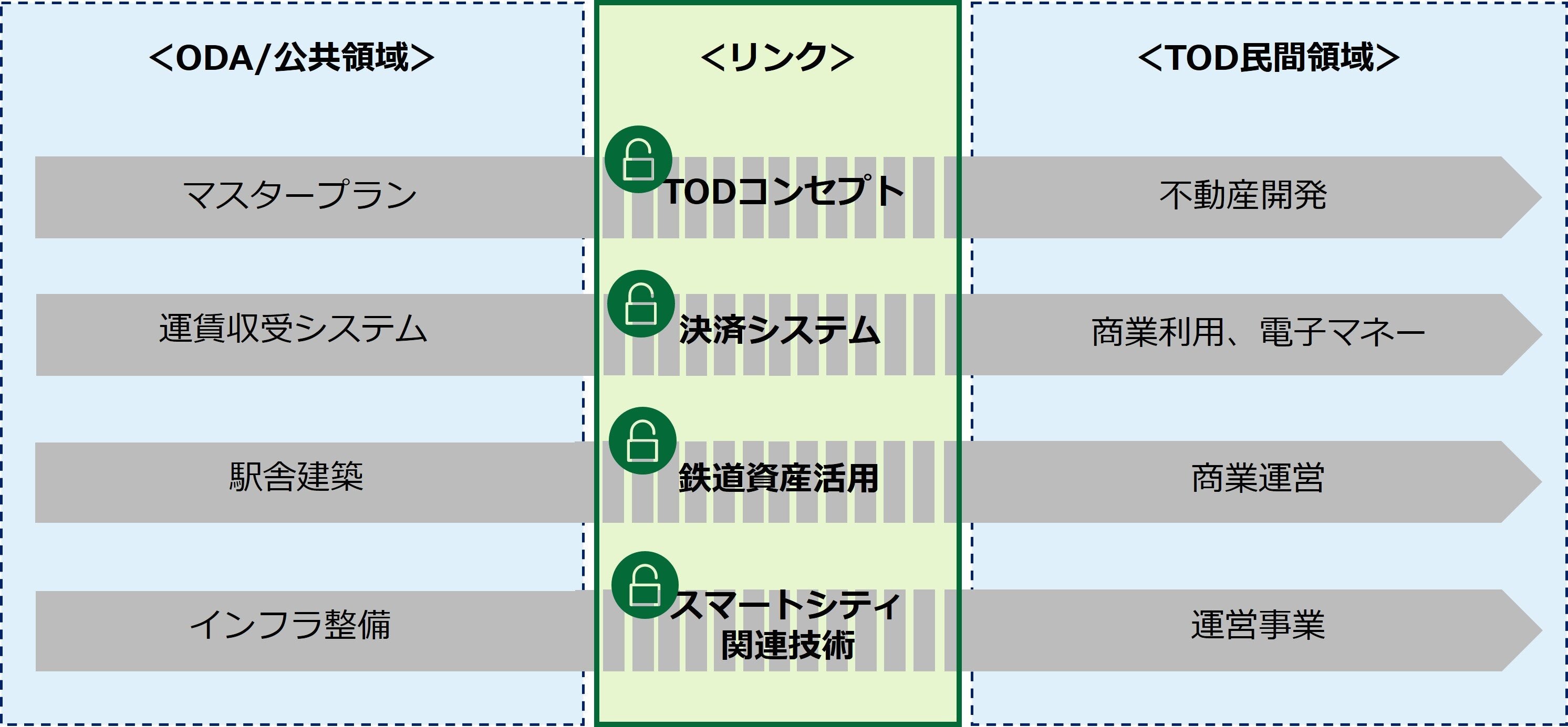 そして、MaaSとともに注目されているのが「TOD」です。TOD(Transit Oriented Development)とは、駅などのハブを核にして、その周辺環境を含めた都市全体の開発を進める戦略のことで、日本語では「公共交通指向型開発」と訳されます。これまで東南アジアの多くの都市では、ODA(政府開発援助)を活用した鉄道開発が行われてきました。しかし、駅周辺の整備はODAの支援対象外であるため、総合的な沿線開発はあまり行われてこなかったのが実情です。そういった背景から下図のように、ODAなどによる公共セクター開発と民間セクター開発を連結させるTODに注目が集まっています。TOD活用により、駅の価値を最大化する街づくりが促進されると考えられます。なお、日本はTOD先進国として知られています。本邦企業もノウハウを有していることから、TODは日本の優位性を発揮できるチャンスととらえることもできるでしょう。