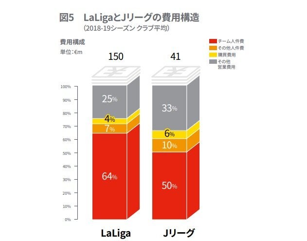 続いて費用構成について、こちらも売上構成と同様に2018-19シーズンにおけるJリーグとLaLigaで比較してみたいと思います。J1平均では、チーム人件費が50%と最も多く、その他人件費が10%、購買費用が6%、その他営業費用が33%となっています。LaLigaでは、チーム人件費が64%、その他人件費が7%、購買費用が4%、その他営業費用が25%となっています。
