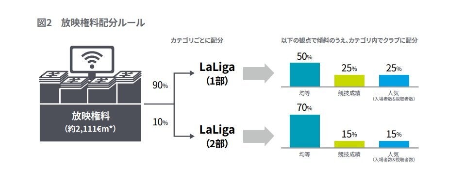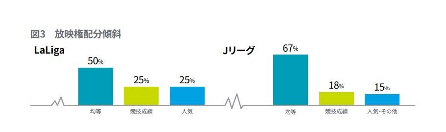 JリーグではLaLigaと比較して、放映権料の配分ルールが均等と競技成績に応じて配分される割合が高いことから、所属クラブの平均的な底上げ効果は発揮できていると考えられます。一方で、ファンベースの拡大に苦戦している状況を鑑みると、ファンベースを拡大させる取り組みを積極的に行ったクラブに報いるような制度設計を検討することも視野に入れるタイミングに来ているとも思われます。