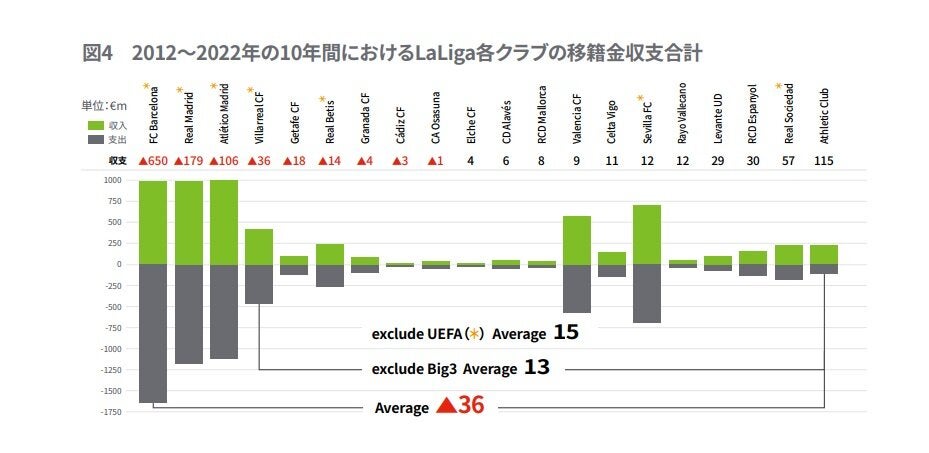 もう1つ、売上構成におけるJリーグとLaLigaの最も大きな違いは移籍金です。Jリーグでは移籍金はその他収入に含まれており、詳細な金額は開示されていません。一方で、LaLigaでは移籍金収支が別途開示されています。その開示内容を集計した移籍金収支から、移籍金はLaLigaの中堅から下位クラブにおける重要な収入源となっていることがうかがえます。