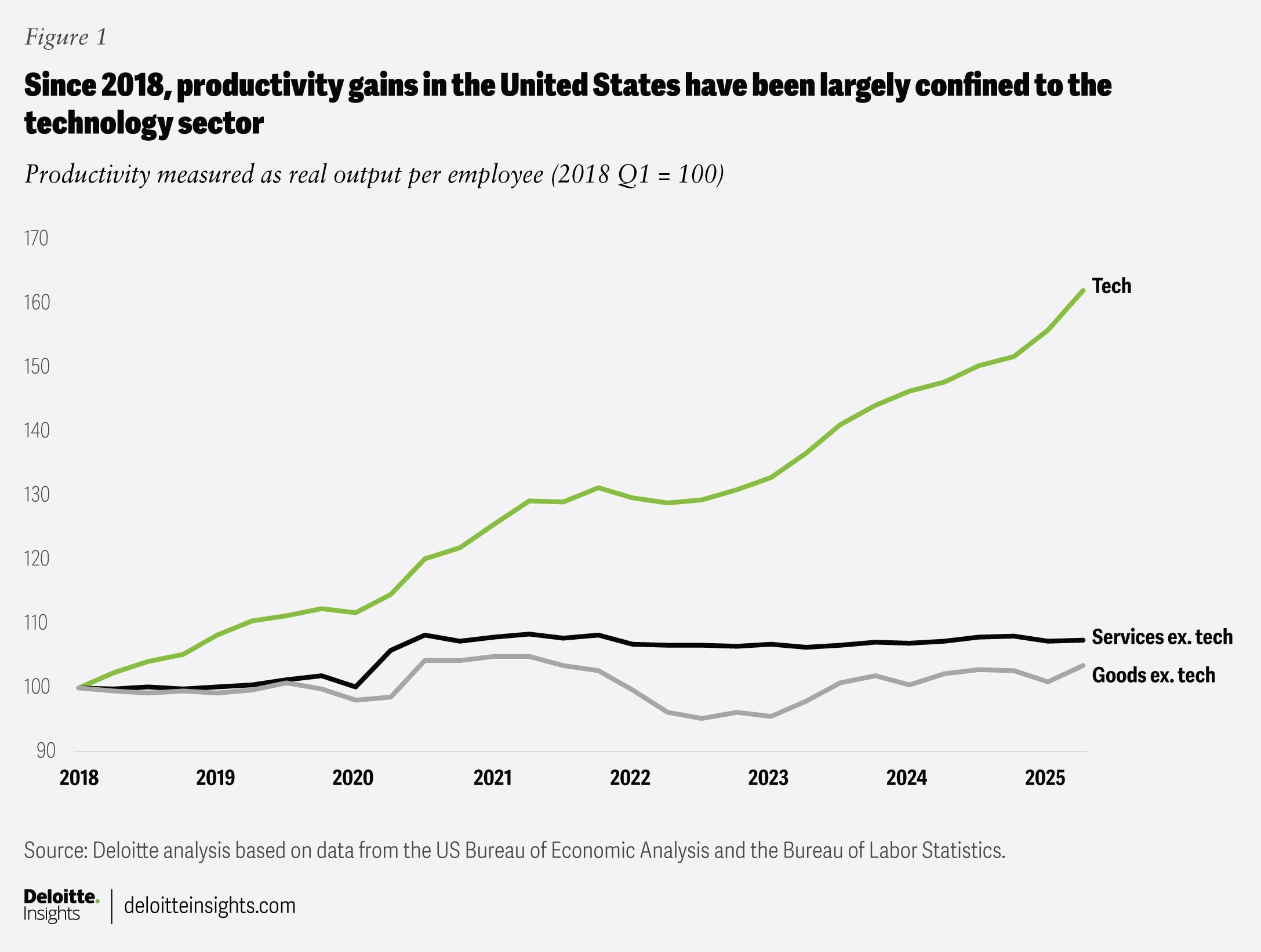 2018年以降、米国における生産性の向上は、主としてテクノロジー部門に限定されています