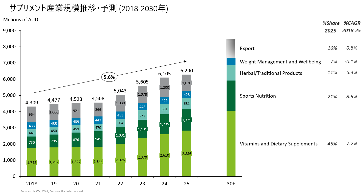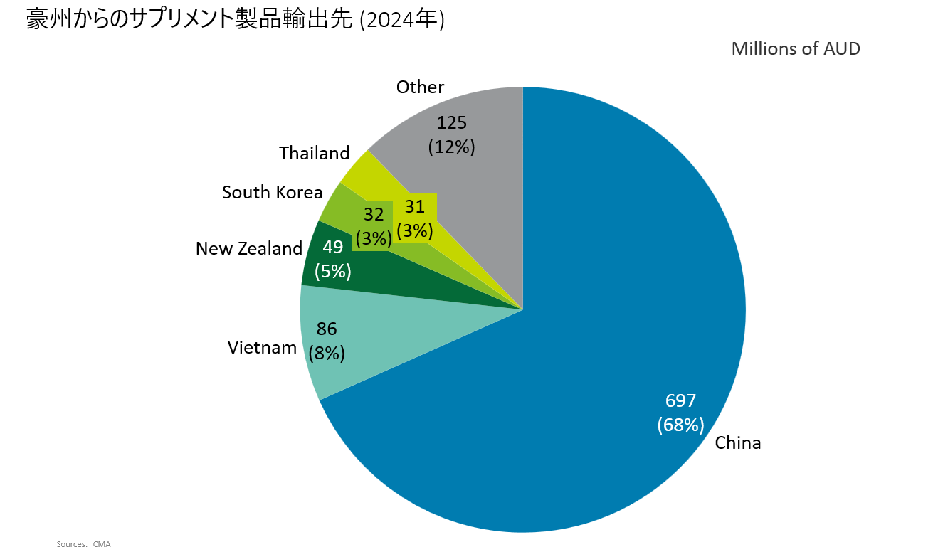 では、何が成長のドライバーとなっているのであろうか。特徴的なのが、国内市場の成長もさることながら、全体の16%を占めている海外輸出分である。2018年時点では9.6億豪ドル程度であった海外輸出分が2024年には12億豪ドルへと拡大しており、今後も成長が想定される点。掲載データの範囲外ではあるものの、2010年代中盤から東アジア・東南アジア中心に豪州サプリメントの人気が急拡大し、それに伴い輸出額が大幅に増加したことが明らかになっている。コロナ禍期間に一時期落ち着いたものの、一段落した2022年以降再び増加基調にある。成長著しい新興市場の需要を見事に捉えてきたと言い換えることができよう。