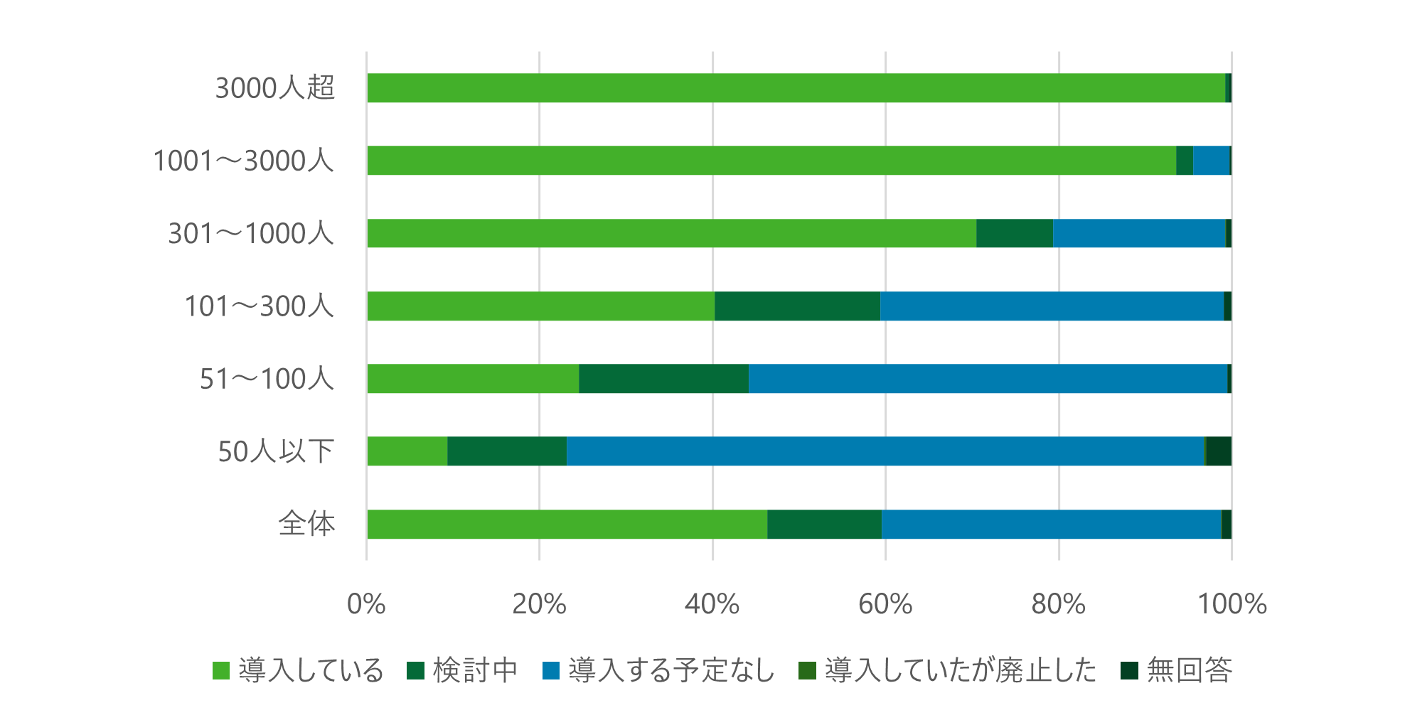 このグラフは、民間事業者の内部通報制度の導入状況を示したものですが、数字は少し古いものであり、2016年度に行われた調査により判明した数字です。改正法では従業員数301人以上の事業者には内部通報制度を含む内部公益通報対応体制の整備などが法的に義務付けられており、それ以外の事業者にも努力義務が課されています(*1)。そのため、改正法が施行された現時点においては、内部通報制度を導入している事業者の割合はより高くなっていることが予想されます。