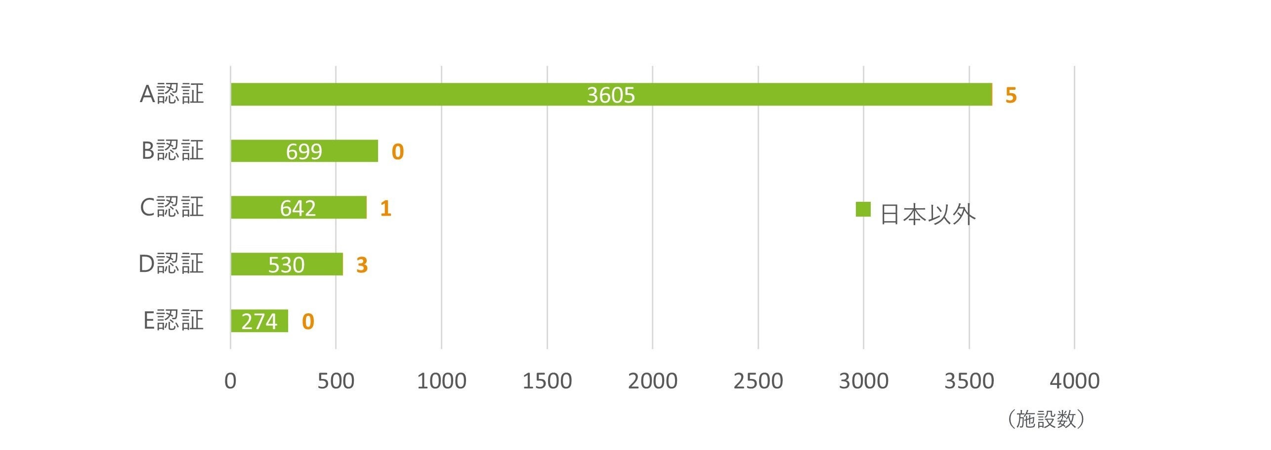 一方で、日本での第三者認証の認知度は低く、認証を取得した宿泊施設は少ないのが現状です。例えば、図2のA認証は、世界の65ヵ国、3,605施設が取得済みですが、うち国内施設は5施設にとどまります。
