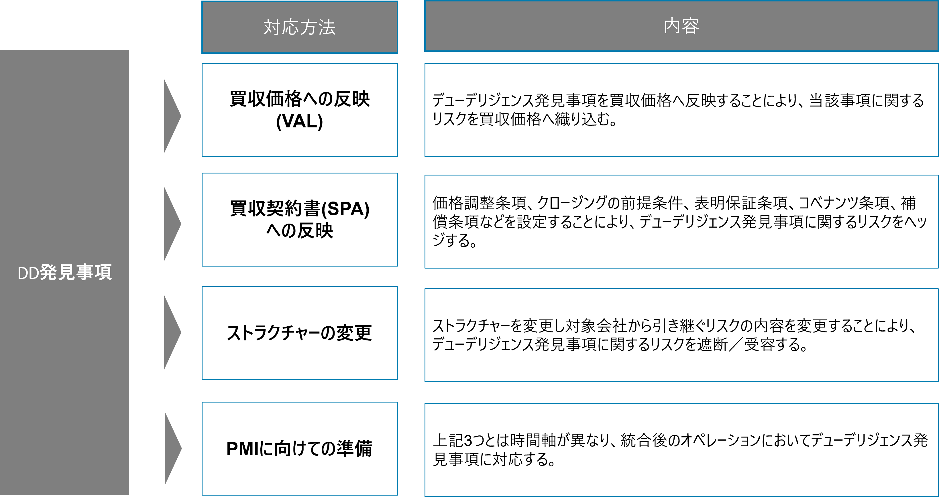 ではPMIをいつ検討開始したらいいのだろうか。具体的な検討を開始する望ましいタイミングとしては、対象会社/対象事業のデューデリジェンスが完了し、各分野での論点・課題が明らかになった時である。デューデリジェンスで判明した課題は、契約や買収価格などに反映させるが、全ての課題を契約や価格に反映することはできないため、残ったものはPMIにて対応することになる。そのため、デューデリジェンスレポートの全体に目を通し、PMIにおいて何をやらなければならないか、論点・課題整理をするところからPMIの準備は始まる。デューデリジェンス前でも検討開始することはできるが、どちらかというと買収の目的や買収後のシナジー検討が中心となるため、対象会社/対象事業の環境づくりの準備という意味ではデューデリジェンス直後が最適なタイミングである。