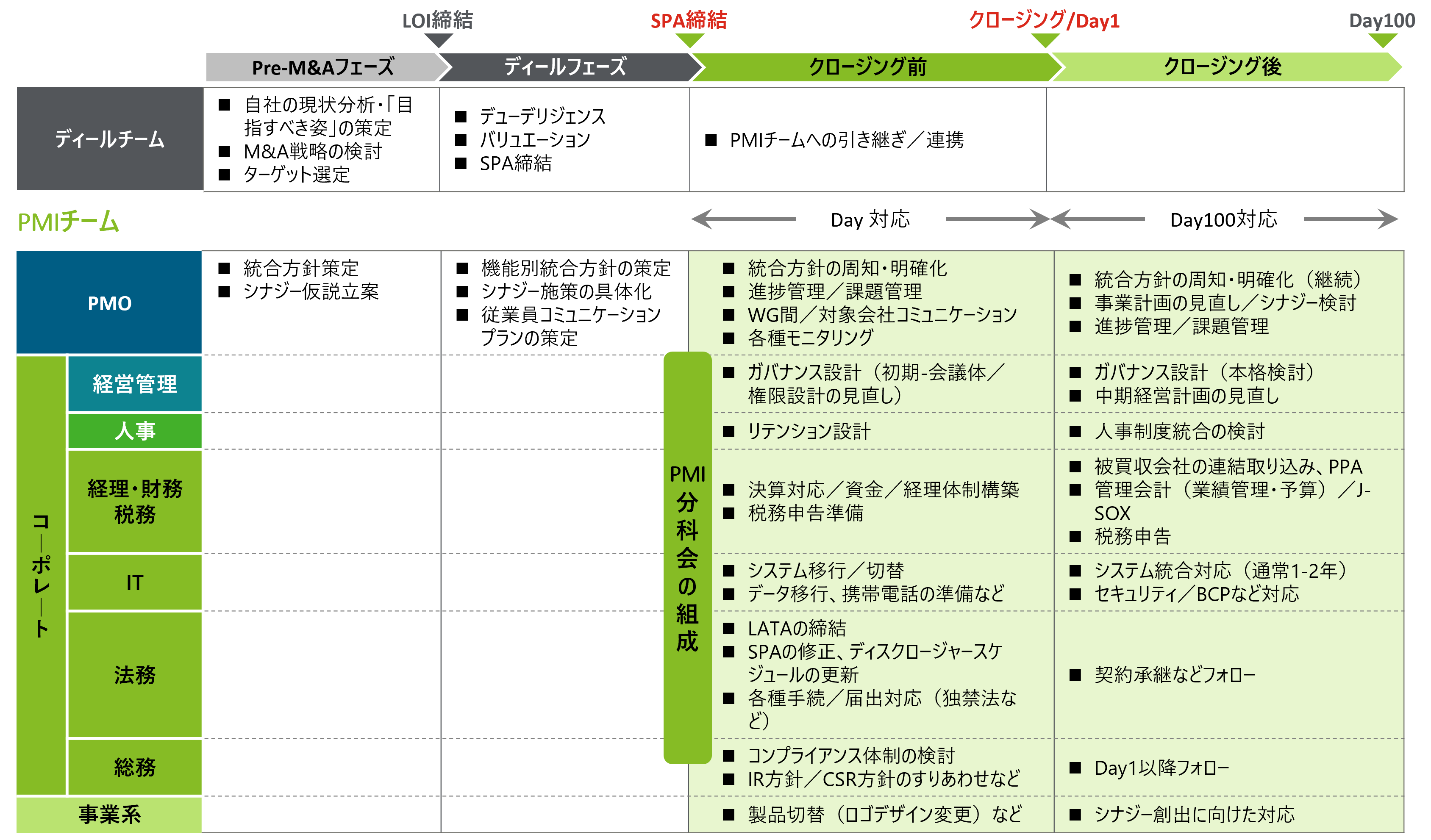 最近ではPMIの重要性が認識され始めているとはいえ、実際には条件交渉などクロージングに関連した重要事項の対応に追われて、検討が遅くなってしまうことが多いため、案件を実施する場合はPMIの準備のタイミングを意識して取り組んでいただきたい。
