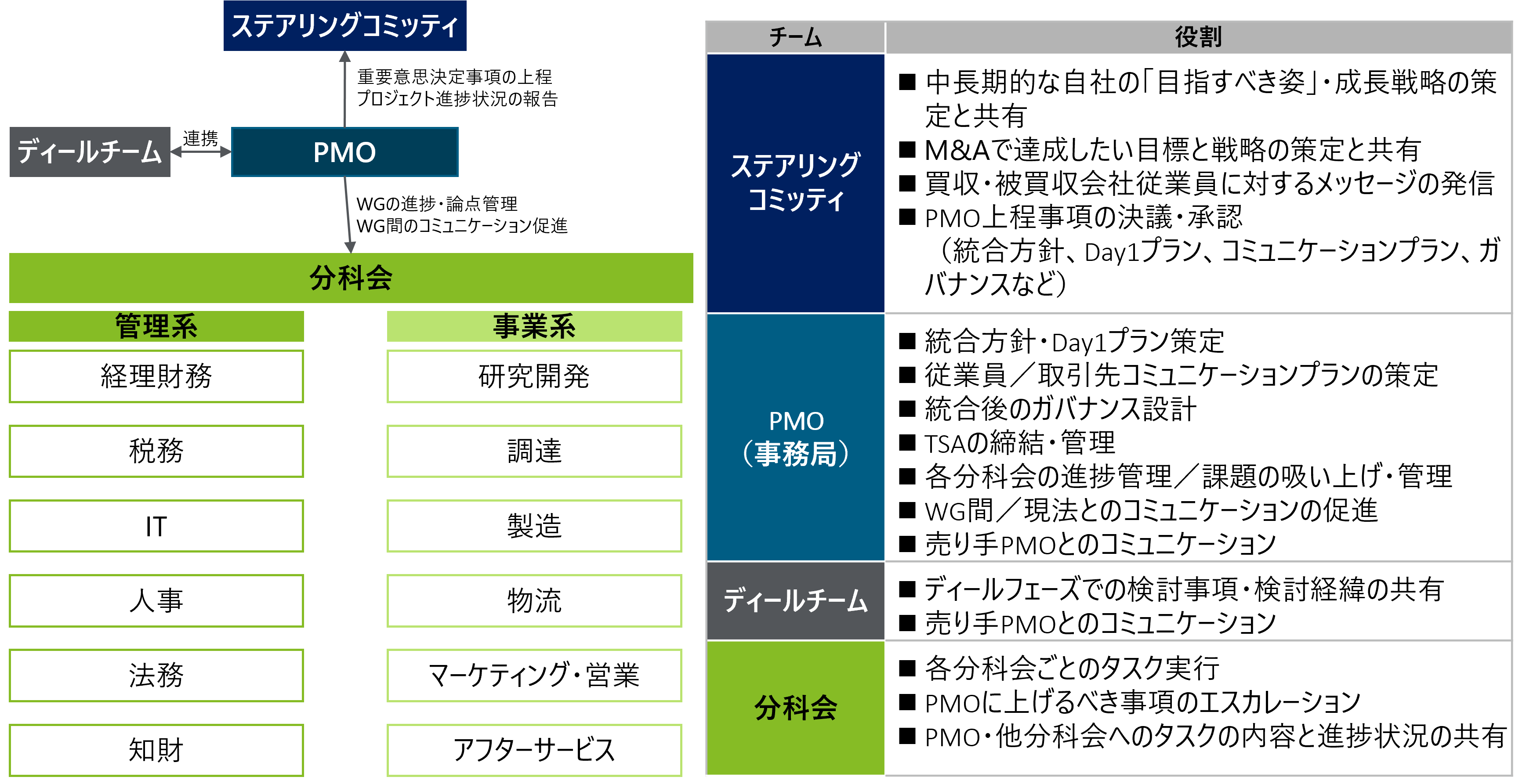 そしてこのPMIを進める体制において重要となるのが、プロジェクトの推進・管理を行っていくPMO(Project Management Office)である。PMOには、経理や人事など各分野に幅広い知識・経験があり、各分野の担当者と必要なタスクや論点について話をすることができる人をアサインすることが望ましい。またPMI特有の論点についても整理して対応を主導していく必要があるため、PMIの専門的な知識を持った外部専門家に支援を依頼することもある。