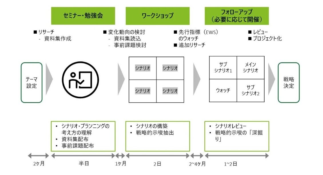 「複数の未来シナリオのうち、どのシナリオに向かっているのか」という方向感を共有し、戦略の方向性を明確にするために、必要に応じてフォローアップのワークショップを行います。ここで各シナリオをもう一度掘り下げて理解し、戦略構築のためのベースを作ります。