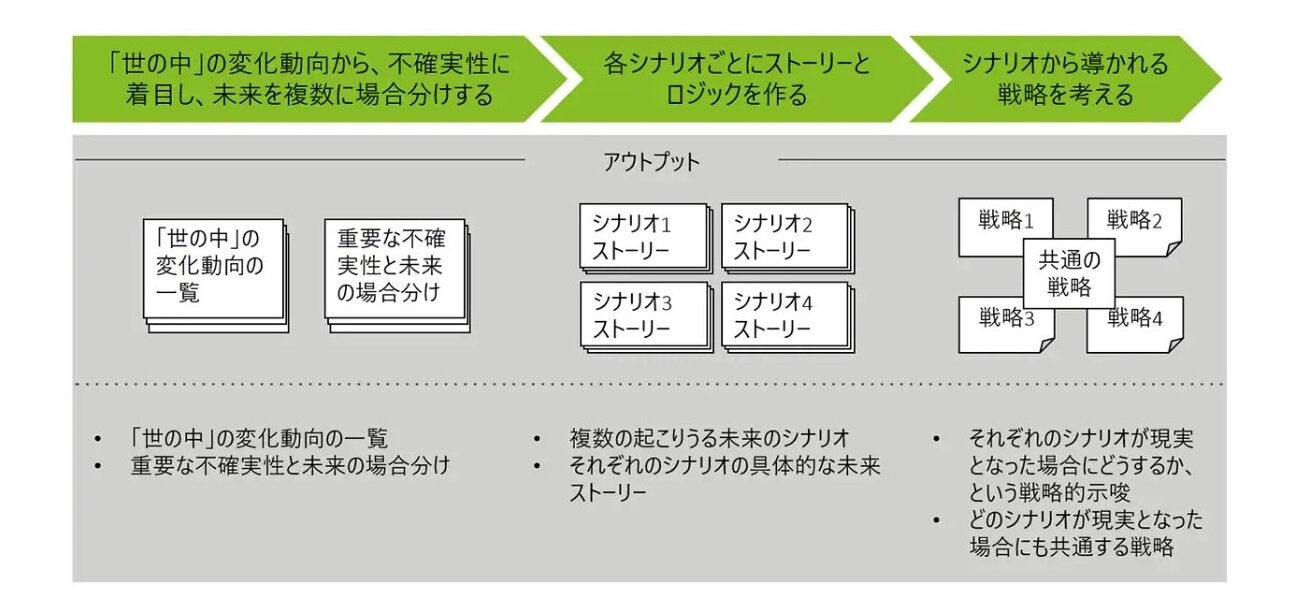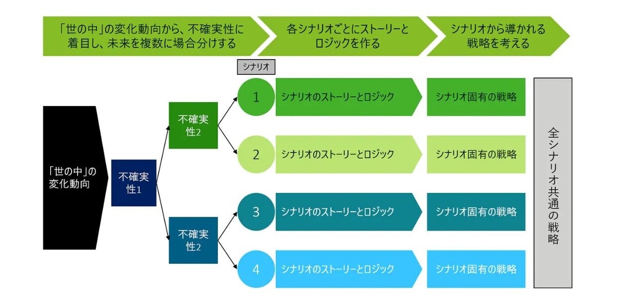 シナリオ・プランニングは、「起こりうる未来」の事業環境を、複数のシナリオとして整理・共有化し、戦略を導くための一連の手法です。
