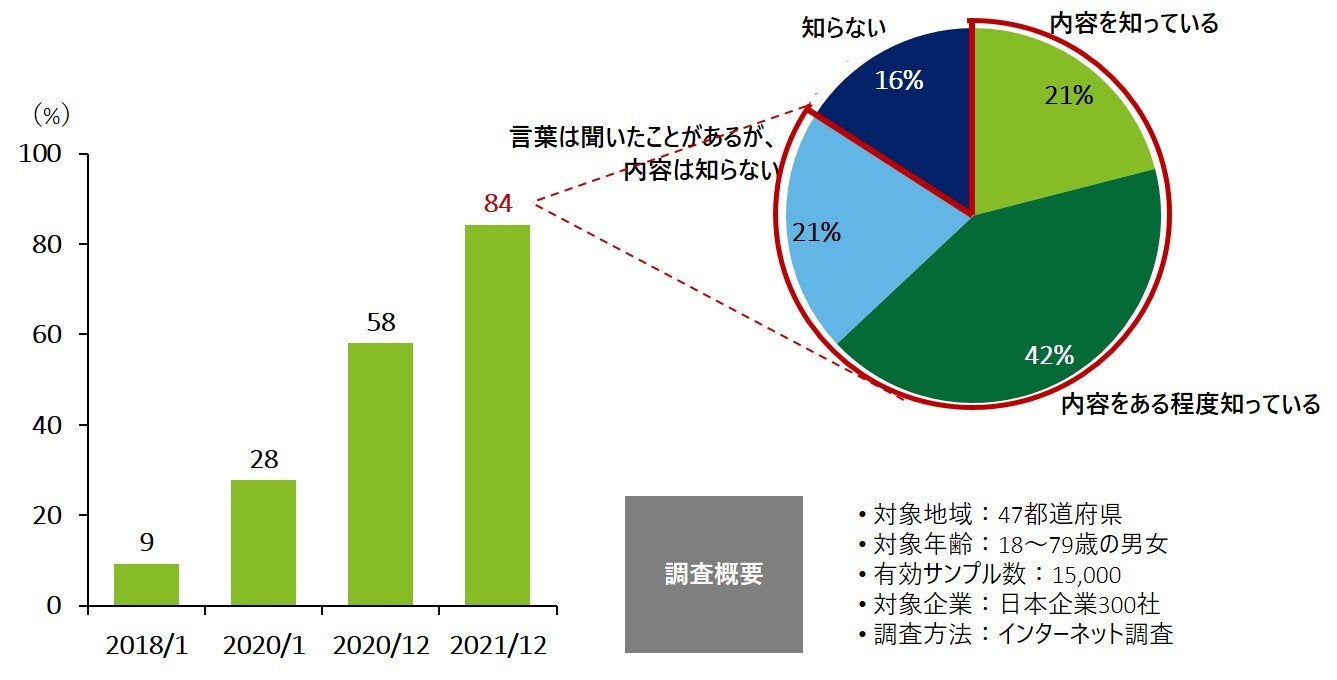 今回の調査から日本におけるSDGs認知度を見てみると、2018年1月時点ではわずか9.3%にとどまっていた認知度が、最新の2021年12月の調査では84.2%と大幅に上昇する結果となりました。