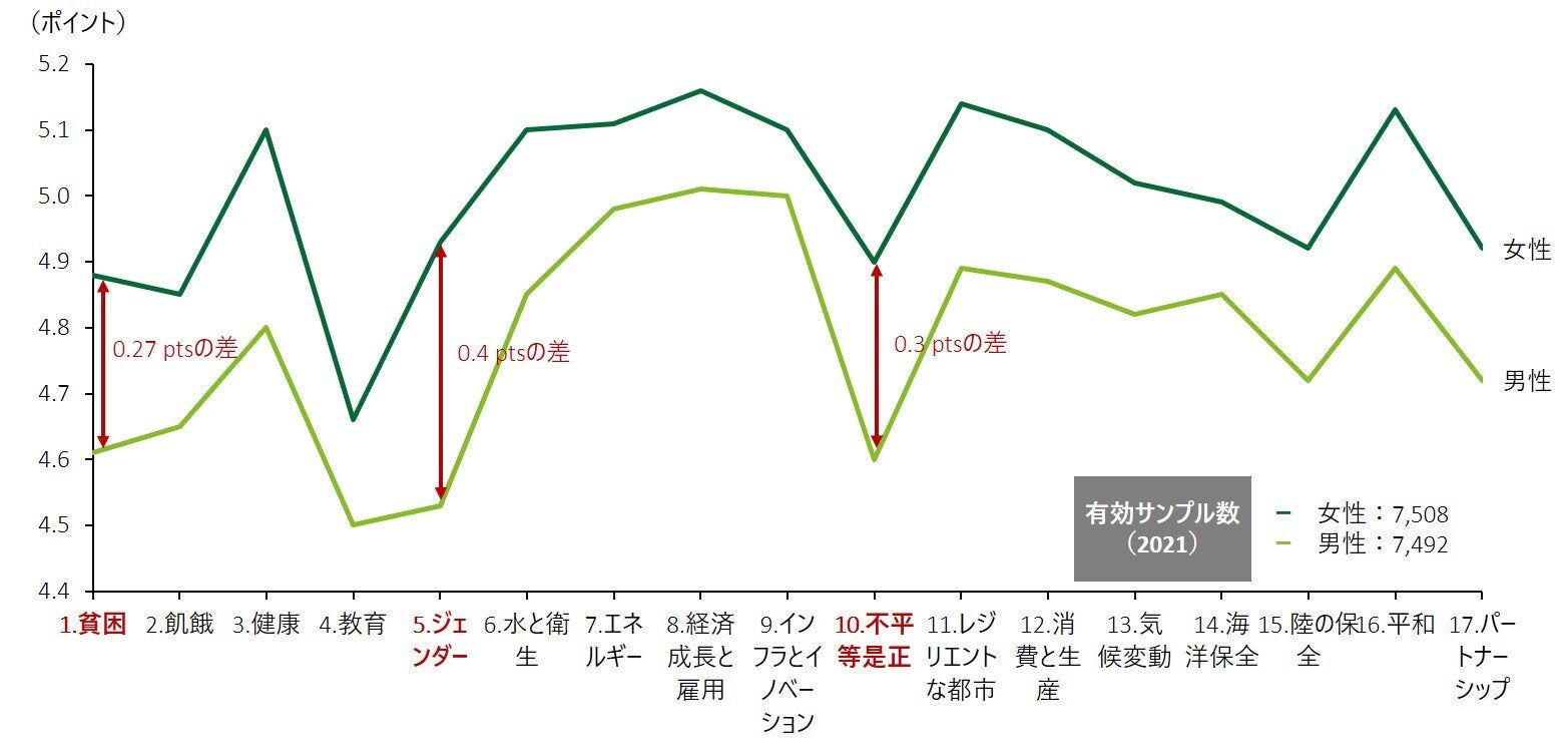 しかしながら、「7.エネルギー」や「8.経済成長と雇用」「9.インフラとイノベーション」では男女差が大きくないことから、サステナビリティと経済成長の両立の観点は、性別に関係なく重視されていることがわかります。