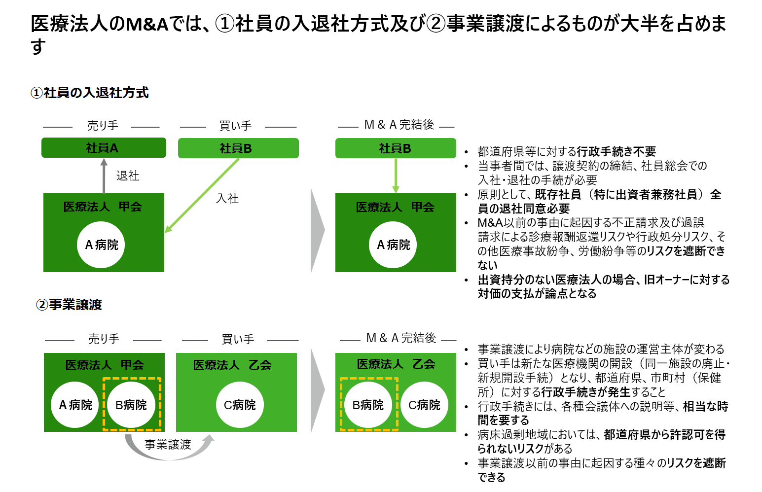病院をM&Aする際の方法としては、社員の入退社方式と事業譲渡の2つの方法が主流となっています。