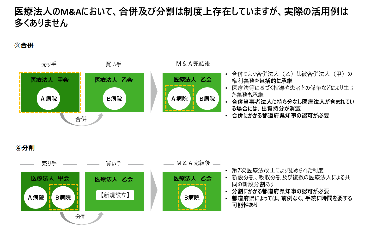 ただ手続き上は病院を廃止したうえで新規開設することになり、都道府県や市町村(保健所)に対する行政手続きが発生します。この際、各種会議体への説明が必要となるため、相当な時間を要することになります。すでに病床が過剰となっている地域では、都道府県から許認可を得られないリスクもあります。