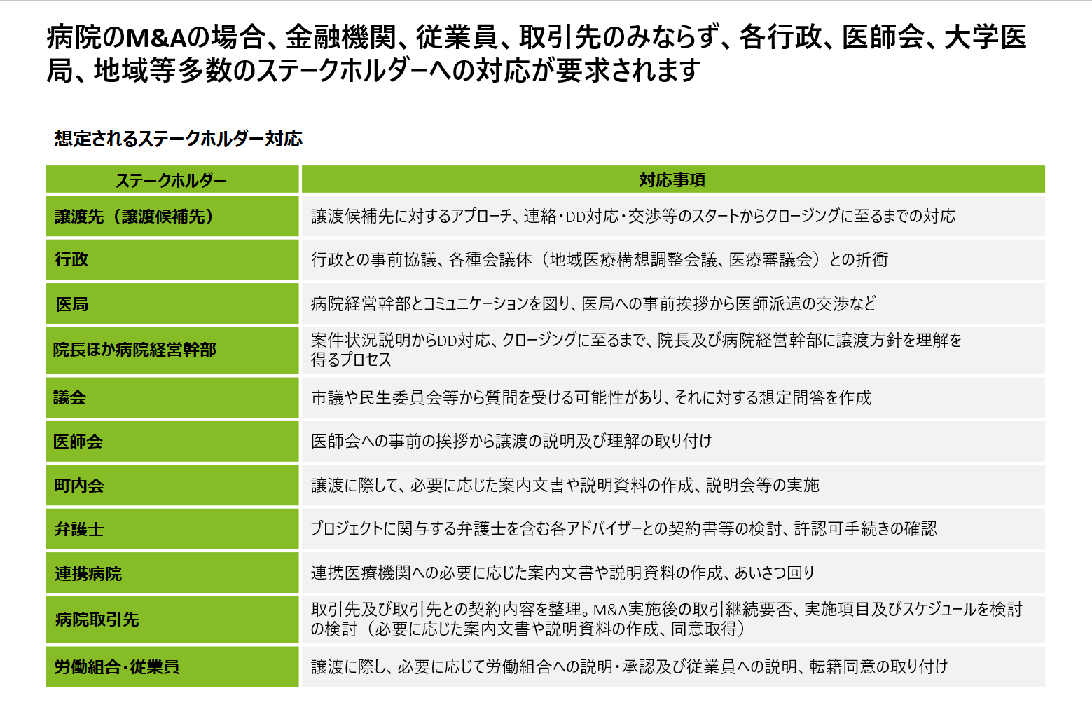 病院のM&Aでは、数多くのステークホルダーへの対応が必要である点も意識しておかなければなりません。