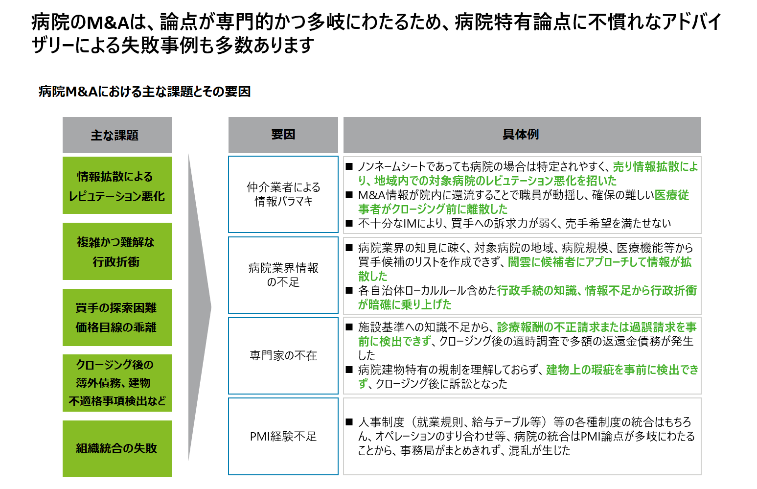 こうした背景から病院経営をそのまま継続することは難しいと判断し、別の医療法人への病院の売却を検討するケースが増加しています。ただ病院のM&Aは、論点が専門的かつ多岐にわたります。このため、病院売却のサポートを不慣れなアドバイザリーに依頼してしまい、売却が失敗に至る事例が少なくありません。