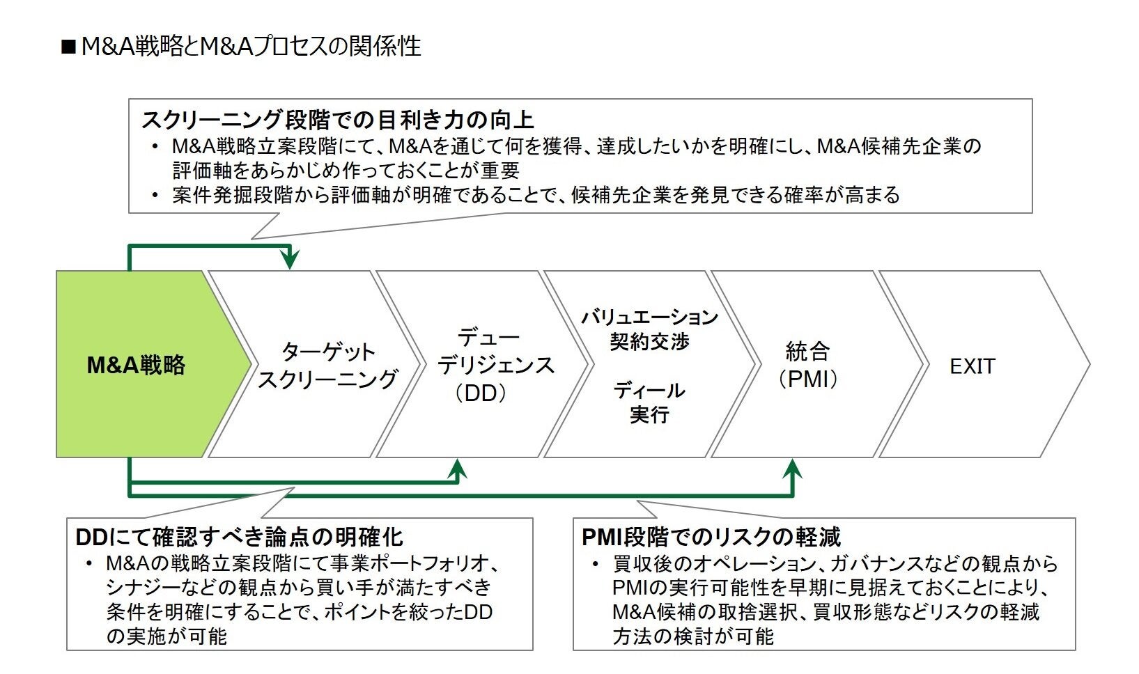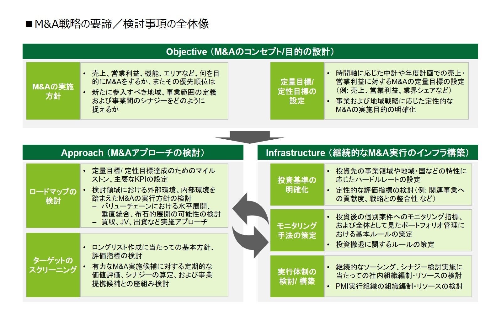 また、M&A戦略にはターゲットのスクリーニングの基準やM&A実行のインフラ構築(投資基準の明確化、モニタリング手法の策定、実行体制の検討構築)も含めることが求められる。