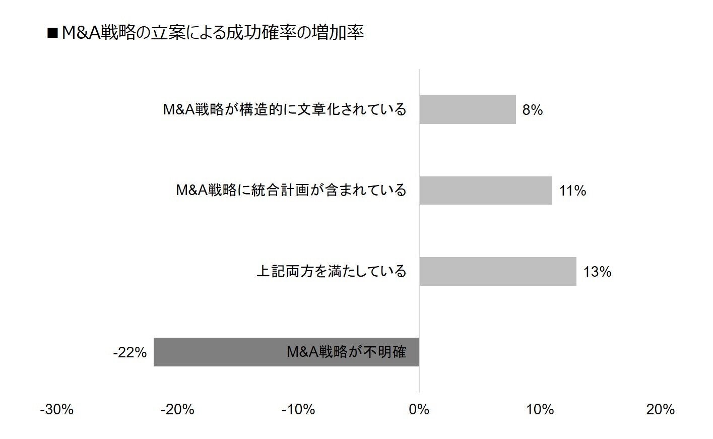 Deloitte Consulting LLCが実施した調査によれば、「M&A戦略が構造的に文章化されている」場合にはM&Aの成功率が8%増加するとされており、「M&A戦略に統合計画が含まれている」場合には11%程度の増加率の寄与がある。また、両方を満たしている場合には13%程度増加につながるとの結果がある。一方で、「M&A計画が不明確」な場合には成功確率を22%減少させることにつながる。この調査結果から言えることはM&A戦略を策定することの重要性およびM&A戦略に統合計画(買収後のPMIに関する計画)を含めることが成功率の増加に寄与するということである。