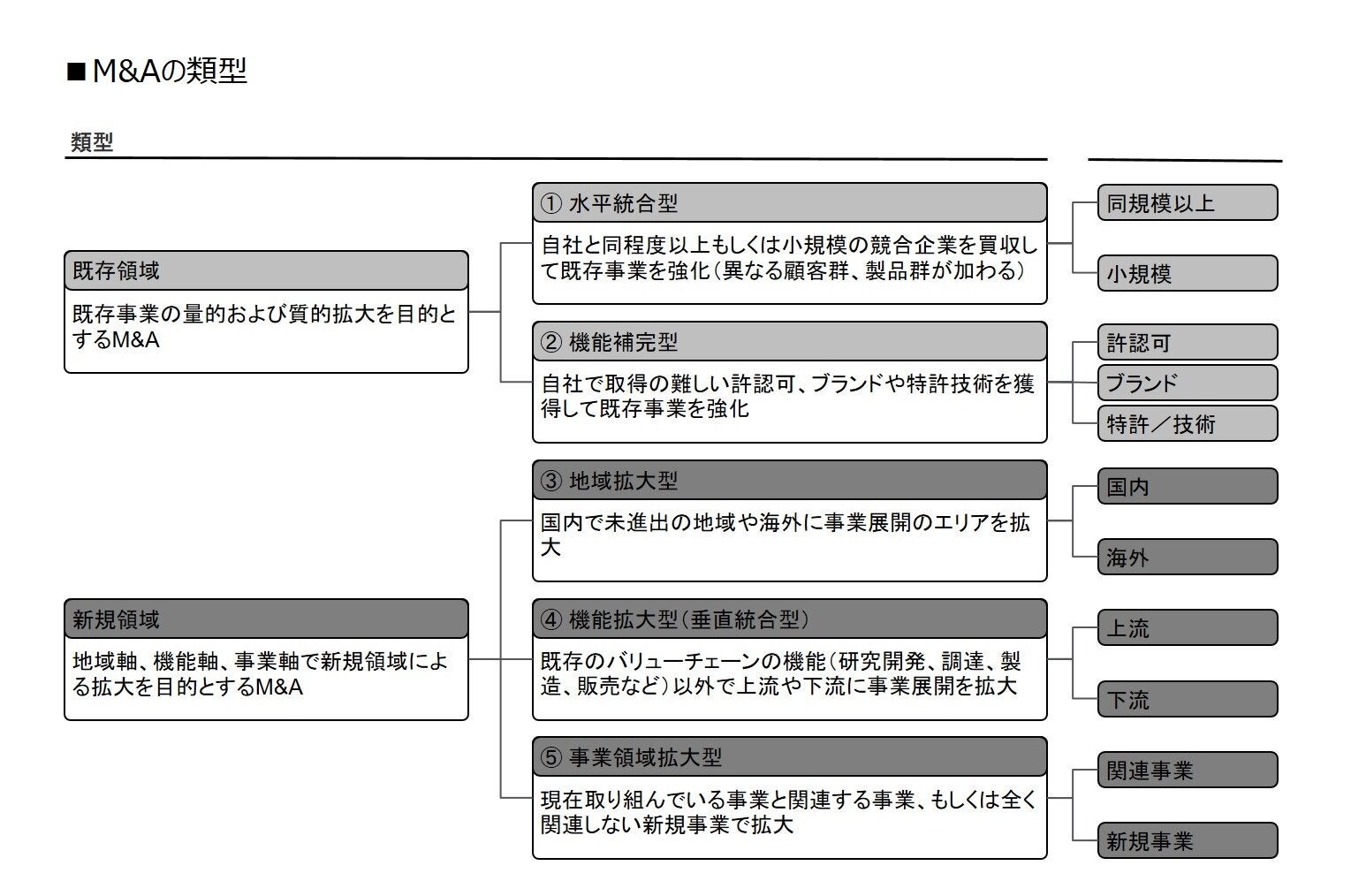 M&Aを類型化すると、既存領域で①水平統合型、②機能補完型、③地域拡大型、④機能拡大型(垂直統合型)、⑤事業領域拡大型に大きく分けられる。自社のM&A戦略はどの類型に当てはまるのか、ほかの類型はM&A戦略に照らし合わせて検討余地はないのか、と考えるのも戦略構築の際に一助になるだろう。