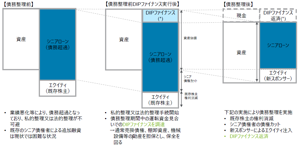 最後に、右図を見ていきましょう。債務整理を図る際には、既存の株式を無償で消却する100%減資を行うことが一般的です。さらにシニアローン債権者の債権を一部カットすることなどにより、債務整理を実施します。100%減資と同時に新たな株主から出資を受け入れ、新株主からの出資金や事業キャッシュフローによりDIPファイナンスから得た資金を返済する、という流れが一般的です。