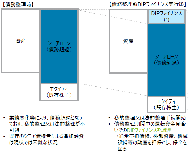 DIPファイナンスとは、民事再生法や会社更生法による法的整理手続下にある再生対象企業(Debtor in Possession)に対して、手続申し立て後から手続終結までの間に行われる融資のことを指します。法的整理手続の申し立て前や、私的整理手続下にある再生対象企業に対する融資であるプレ DIP ファイナンスを含めて、広義の DIP ファイナンスということもあります。