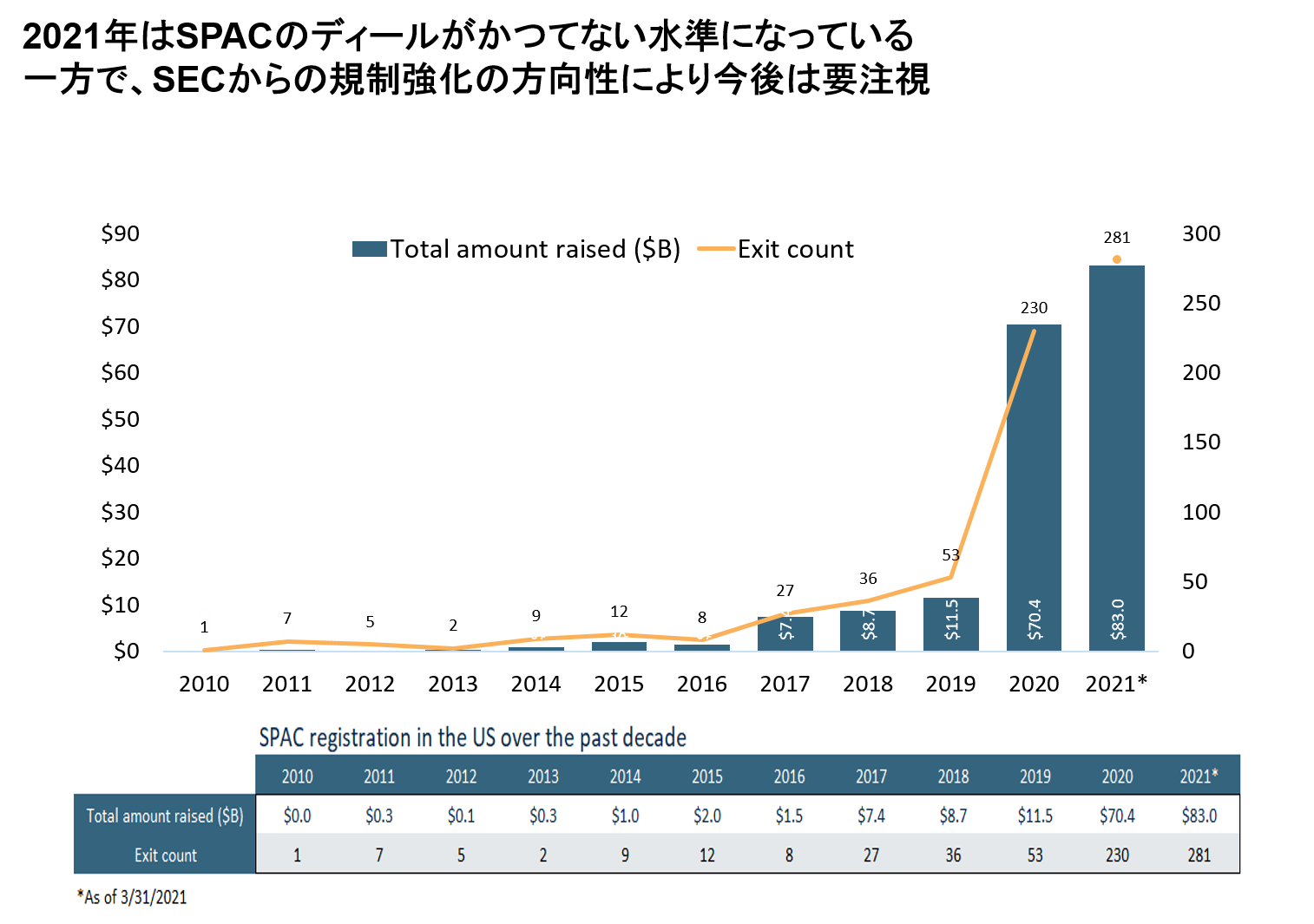 未公開会社の買収を目的として設立される、SPAC(Special Purpose Acquisition Company:特別買収目的会社)をスキームに組み込んだディールが増加しています。2019年は53件に過ぎませんでしたが、2020年は230件、そして2021年は3月時点ですでに281件も行われています。SPACの仕組みによって出口がしっかり確保されたことで、ベンチャー投資が加速しているという状況です。