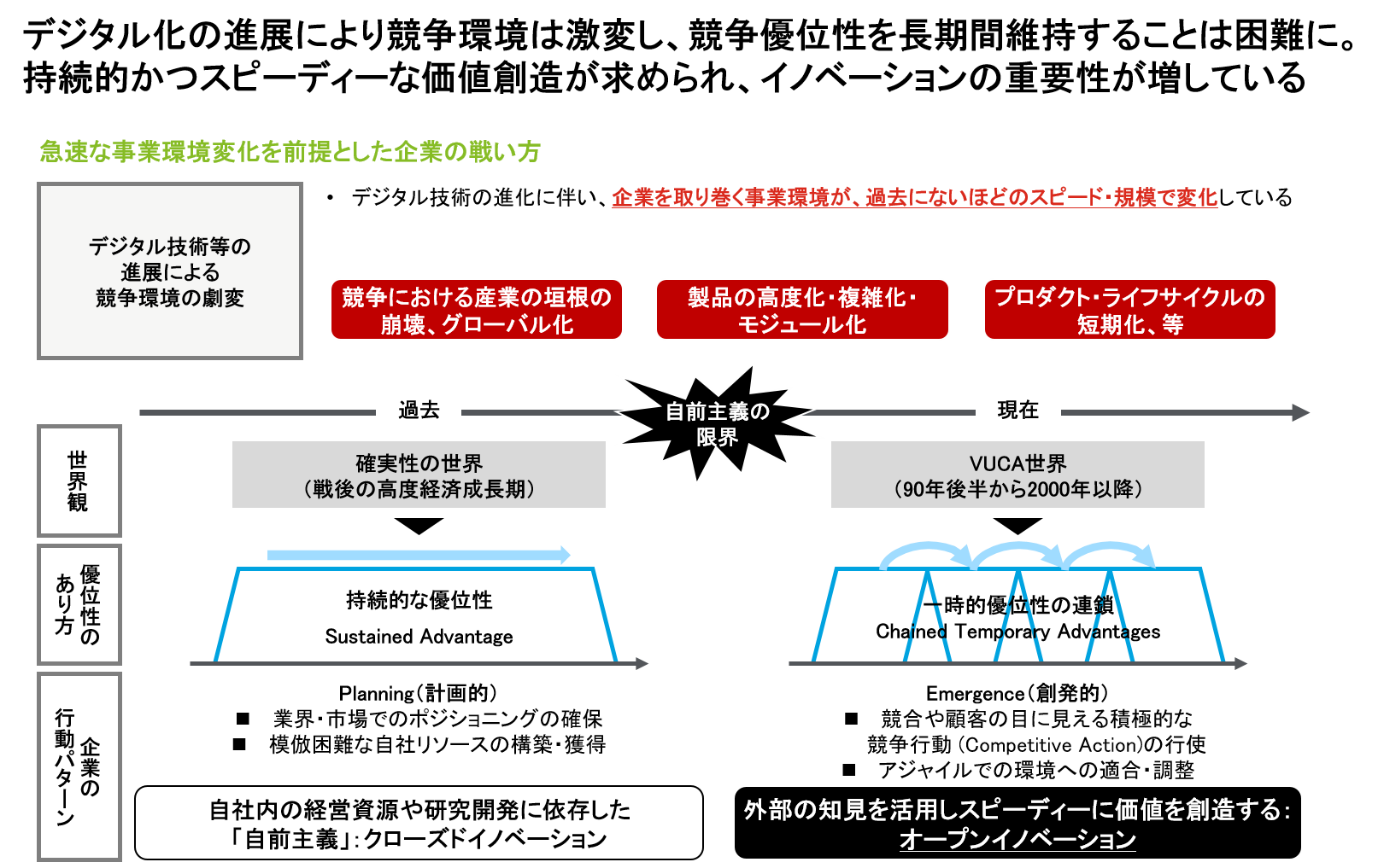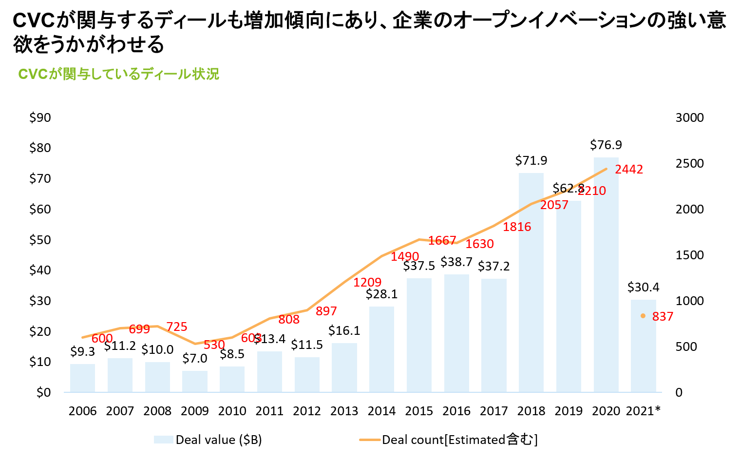昨今、存在感を増しているのがコーポレートベンチャーキャピタルです。不確実性が非常に大きくなっている時代だからこそ、競争優位の源泉を様々な形で取り入れる必要があり、その手段の1つとしてコーポレートベンチャーキャピタルを通じた投資に力を入れているという構図です。