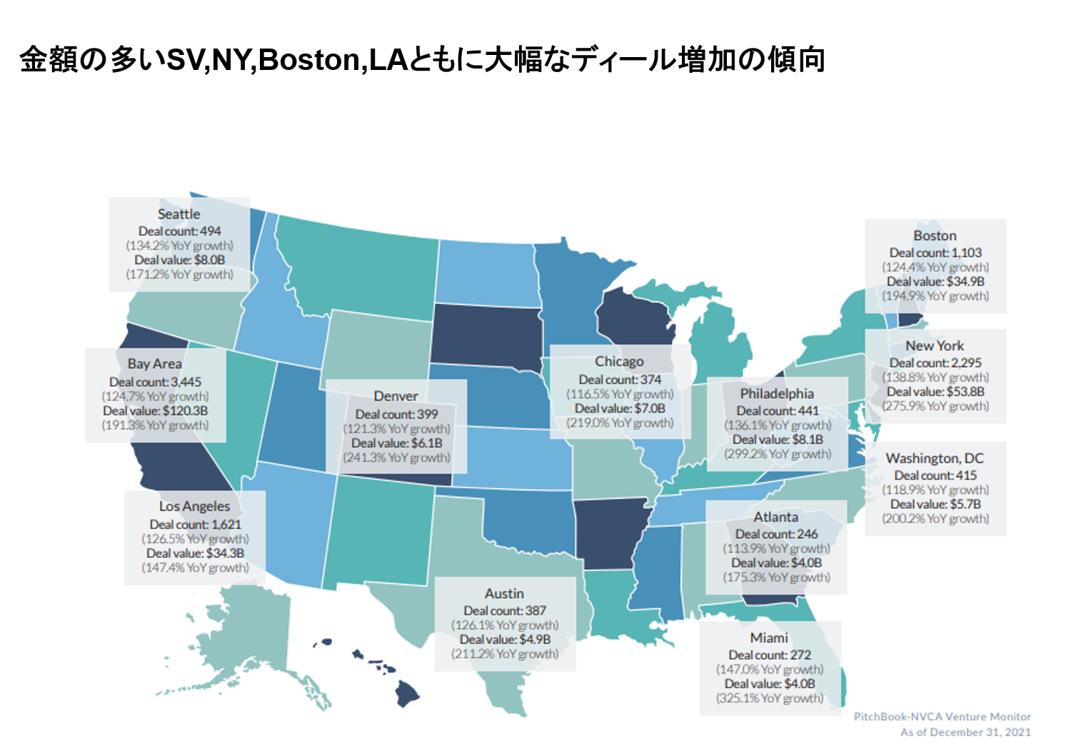 地域別でると、シリコンバレーのディール件数は前年よりも減少していますが、ディールバリューは逆に50%以上増加しています。その他の地域でもディールバリューは伸びていて、例えばシアトルは164%増、ニューヨークで143%増です。アメリカで投資が過熱している状況が分かるでしょう。