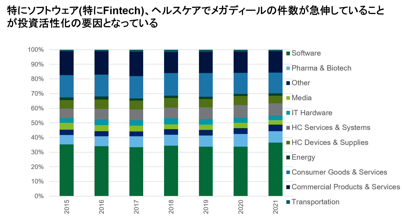 活性化の要因として挙げられるのは、特にFinTech領域のソフトウェアと、製薬やバイオといったヘルスケア領域におけるメガディール件数の急増です。例えばソフトウェア領域の場合、2020年のメガディール件数は107件でしたが、2021年は半期で既に141件に達しています。