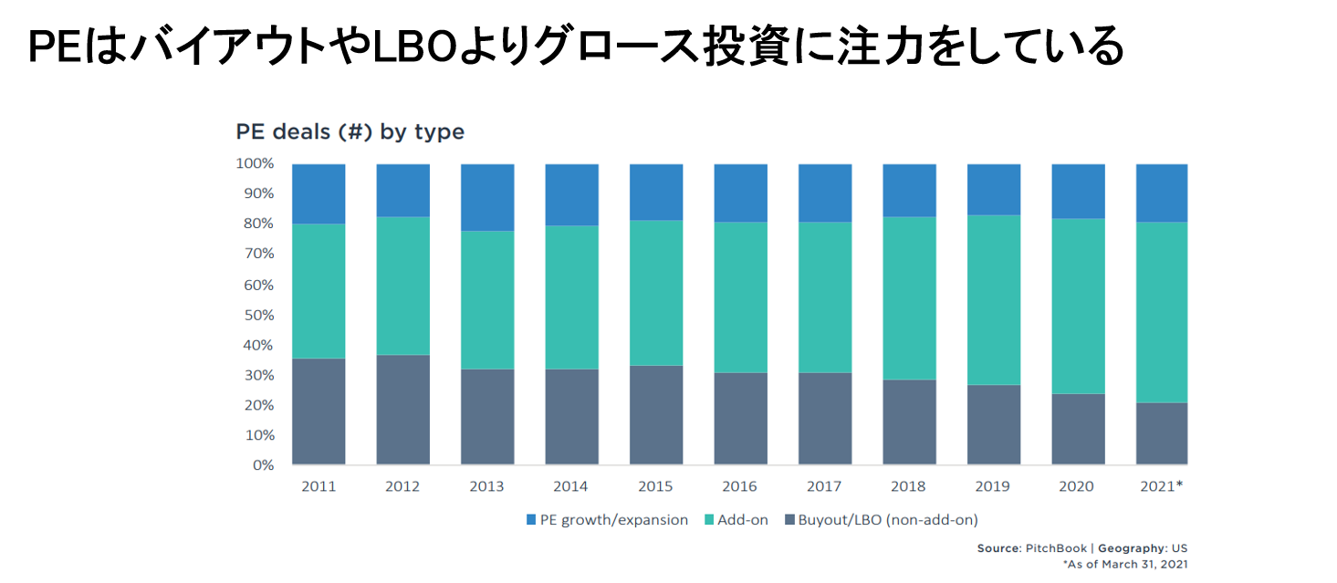 実質ゼロ金利によって金余りの状態となっていることに加え、キュアピタルゲイン税の税率引き上げの可能性が高まっていることから、ベンチャーキャピタルにおける利益確定のためのエグジットが進んでいます。そしてプライベートエクイティはバイアウトやレバレッジド・バイアウトよりもグロース投資に注力していることから、このようにだぶついた資金がグロースステージにあるベンチャーに流れ込んでいます。