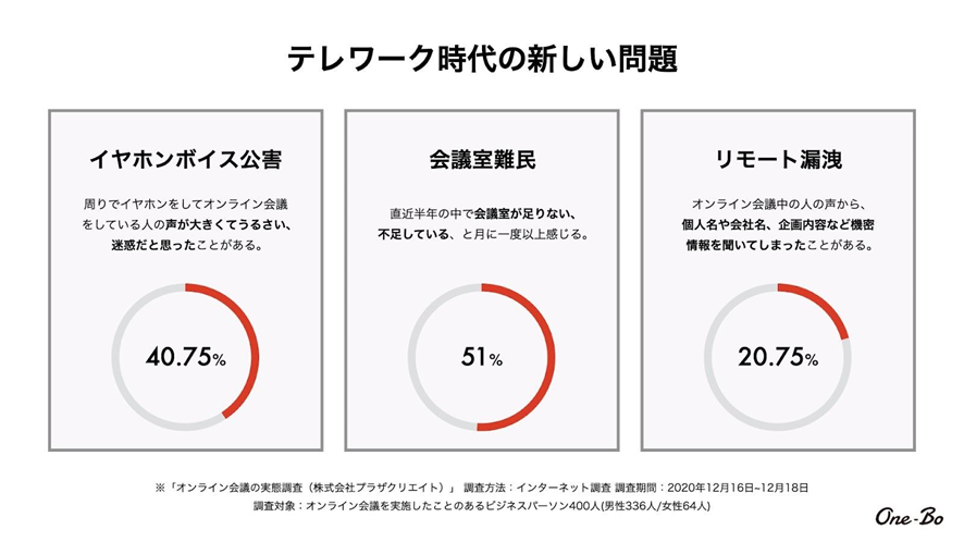 新規事業を考えている時期にちょうど新型コロナウイルスの流行が始まり、当社でも社内の至る所でオンライン会議が行われるようになりました。ただ、オフィスではオンライン会議がすごくやりづらいことに気付いたんですね。