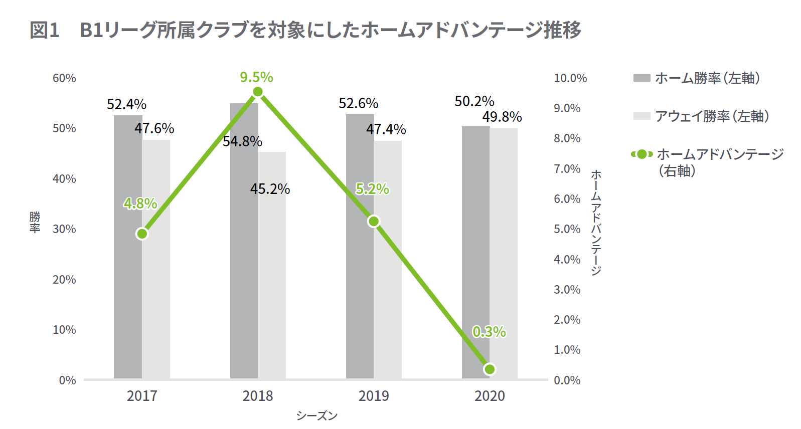 まず、B1所属クラブ全体におけるホームアドバンテージについて、過去4シーズンを通じてどのように推移しているのかを確認しました。