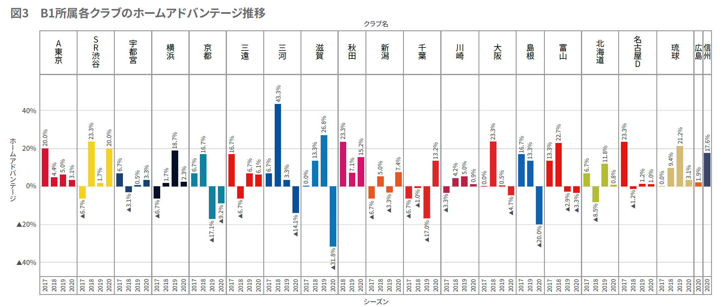 一方で千葉やSR渋谷などはホームアドバンテージを大きく上げたクラブであるといえます。千葉は昨シーズン▲17.0%という結果でしたが、2020年シーズンは13.2%と改善しました。